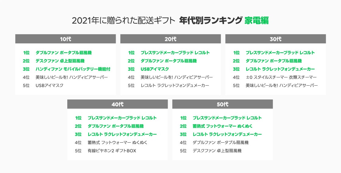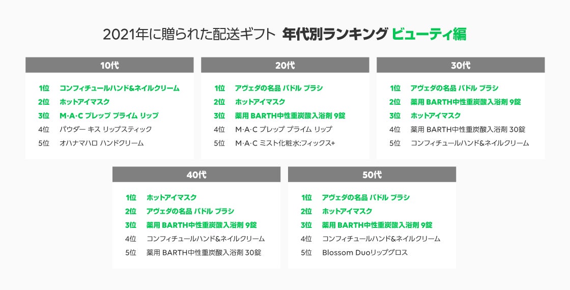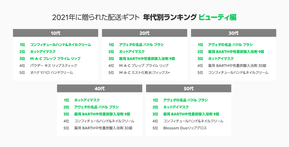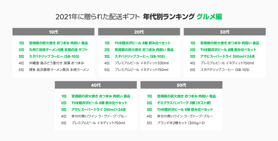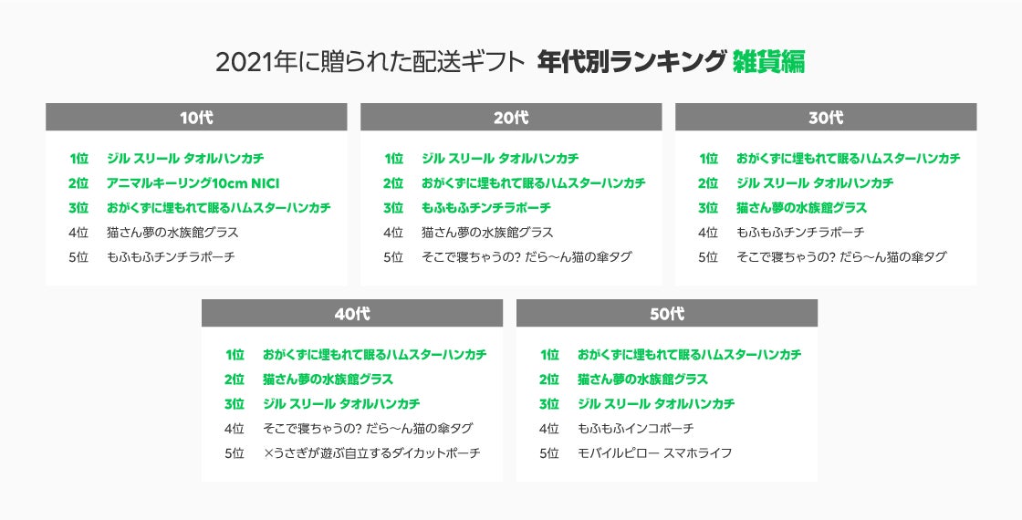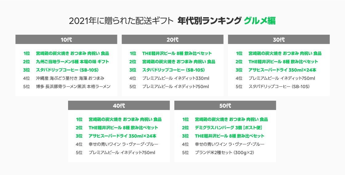 LINE株式会社(本社:東京都新宿区、代表取締役社長:出澤 剛)は、当社が提供する、「LINE」を通じて友だちに様々なプレゼントを贈ることができるサービス「LINEギフトhttps://gift.line.me/about」における、2021年に同性同士や異性に向けてどのようなギフトがよく贈られていたかや、カテゴリーごとの年代別の人気ギフトなどに関する結果をお知らせいたします。