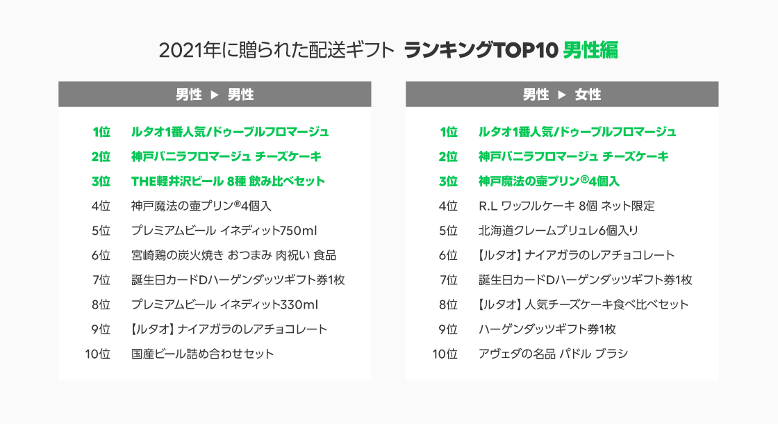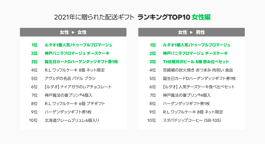 2021年に同性間(女性から女性、男性から男性)・異性間(女性から男性、男性から女性)で贈られた配送ギフト総合ランキングでは、ルタオの「ドゥーブルフロマージュ」が圧倒的人気という結果になりました。次いで「神戸バニラフロマージュ チーズケーキ」の人気が高く、どのランキングでもスイーツの人気が高い傾向がある中でも、上位2つを占めている“フロマージュ”が特に支持を得ていることがわかりました。