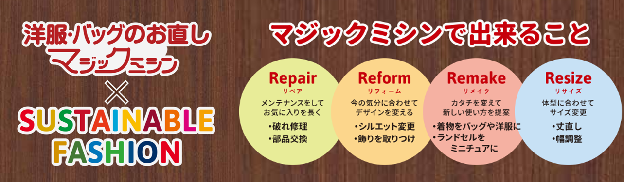 「お直しドリームキャンペーン」とは、7月4日が「ファッションお直しの日」(一般社団法人日本記念日協会認定)に制定された記念に、「マジックミシン」「リアット!」が持つのお直しの技術を通じて、でお客さまお気に入りのもの、大切なものをお直し修理、リメイクして生まれ変わらせたいというお客さまのファッションに関するのお直しの夢を叶えるお手伝いをさせていただくキャンペーンです。