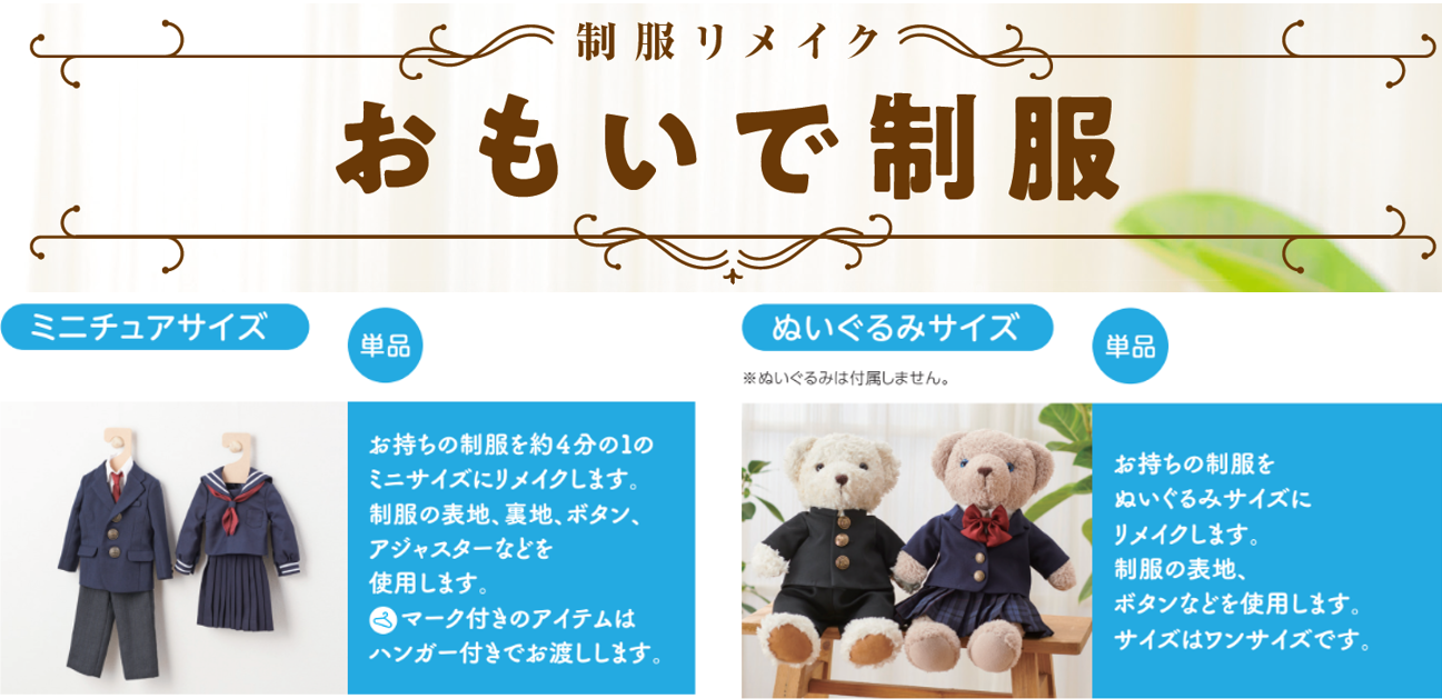 学生生活の想い出が詰まった制服をミニチュアサイズへリメイクする「おもいで制服」や小学校の想い出が詰まったランドセルを「お財布」や「壁掛け時計」へリメイクする「ランドセルリメイク」など、想い出をいつまでもそばに置いておける新サービスとなります。