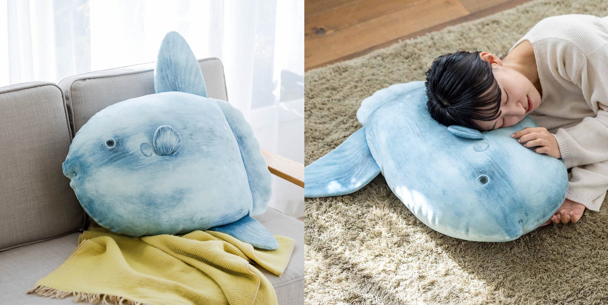 横浜・八景島シーパラダイスの飼育員さん監修のもと、水族館に搬入された当時の個体とほぼ同じ大きさで作られたクッション。胸びれや背びれなど、細部まで本物に近づけています。お部屋に置いておくだけで存在感抜群。