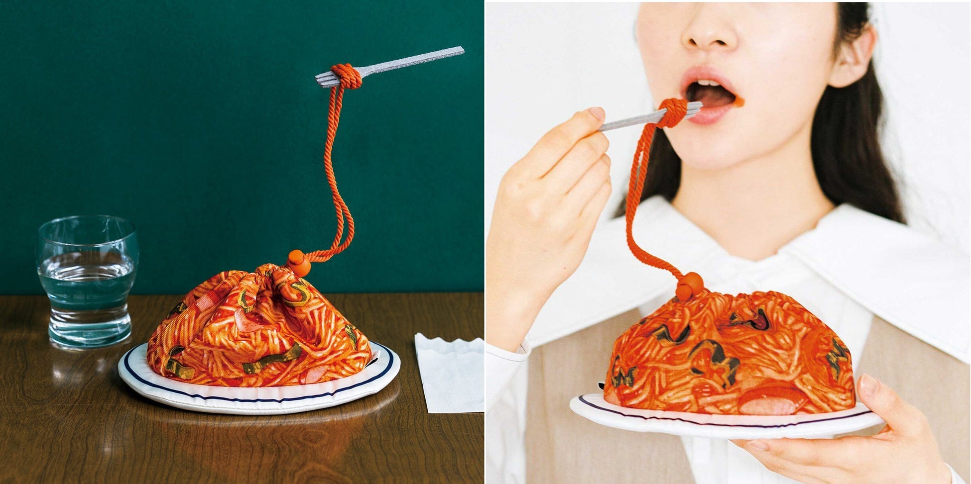 一度食べるとやみつきになる喫茶店の定番メニュー「ナポリタン」を再現。麺に見立てたひもの先にはフェルトのフォークも付いていて、本物のナポリタンを食べているようなシーンを何度も楽しめます。