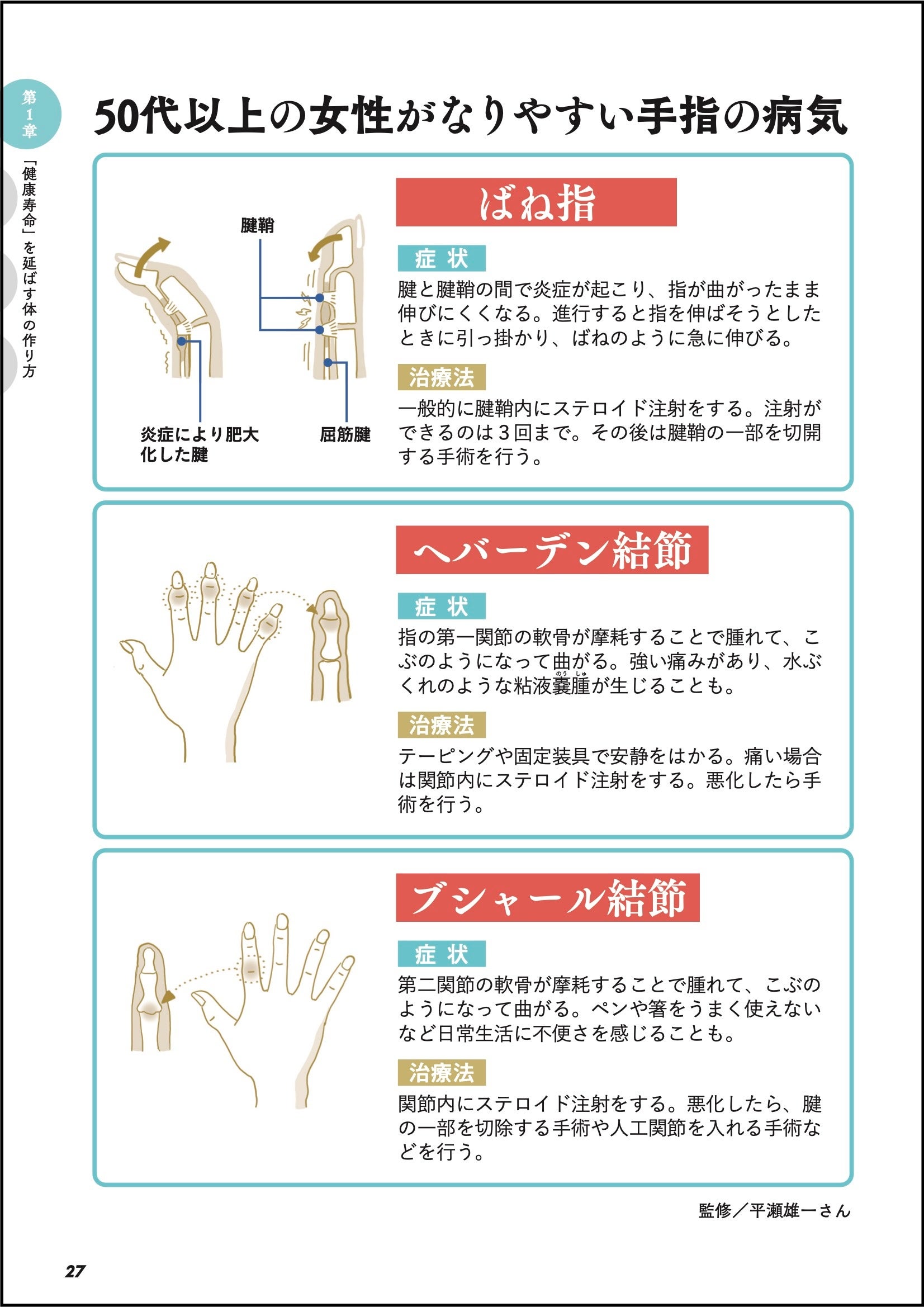目や耳、手指の不調のほか、便秘や夜間頻尿、認知症など、50才を過ぎたあたりから感じ始める体の不調や病気について、解消法と治療法を解説。なんとなく感じていた不調の原因がわかるほか、何科の病院にかかればいいのかわからなかったという人にもズバリ。今すぐ役立つ、この世代特有の体の変化に特化した情報が網羅されています。