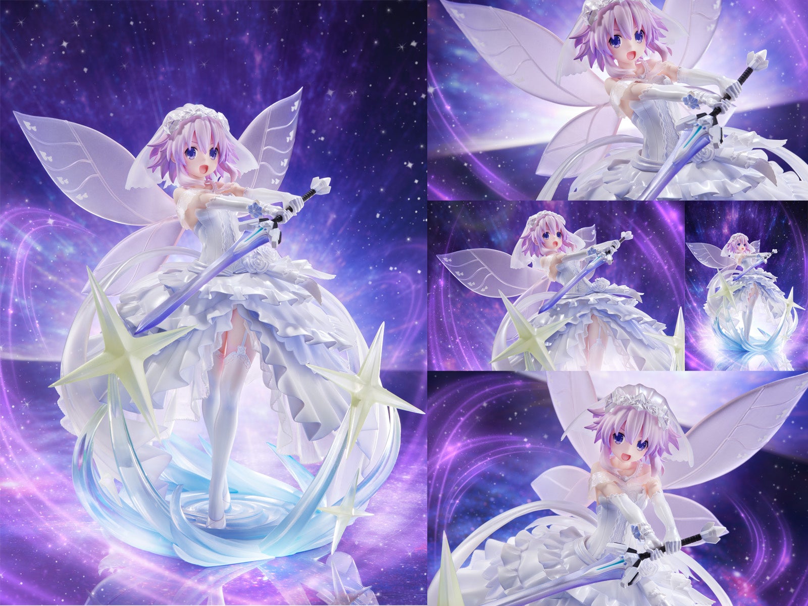 新作OVA『超次元ゲイム ネプテューヌ ~陽だまりのリトルパープル~』より、シェアクリスタルの輝きに包まれたネプテューヌが純白のドレス姿となって顕現した “リトルパープル”を1/7サイズで立体化! 儀礼剣を携えた神秘的な佇まいを忠実に再現。キリリとした差し替え表情パーツが付属。髪飾り・スカート部は脱着可能。ブロッコリー製。