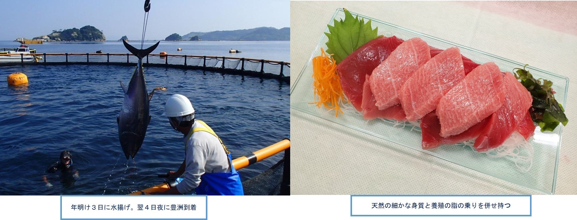 おいしさの特長:6月頃に対馬沖で漁獲し約半年と比較的短い期間畜養します。これにより、天然ものの濃厚な味わいと養殖の脂の乗りが特長です。養殖場は対馬海流の早い潮流の中にあり、本まぐろはこれに乗って運動することで、身質のきめ細やかさも特長です。