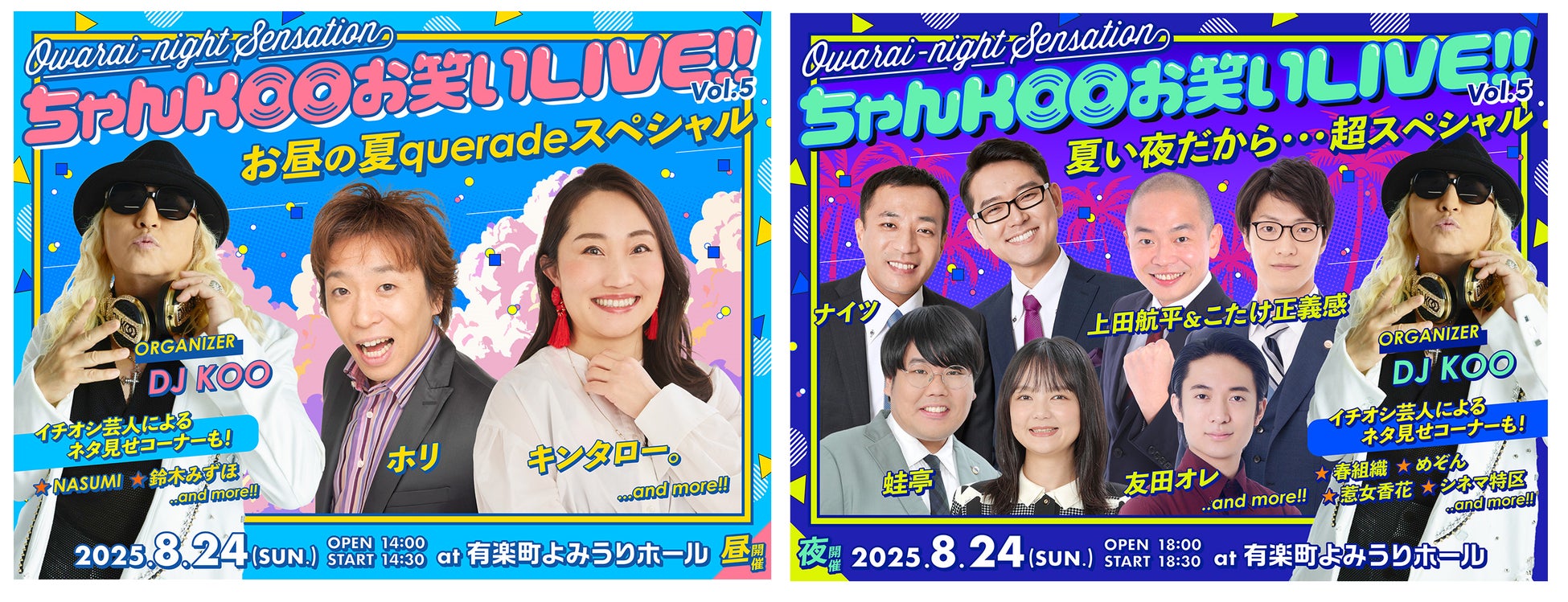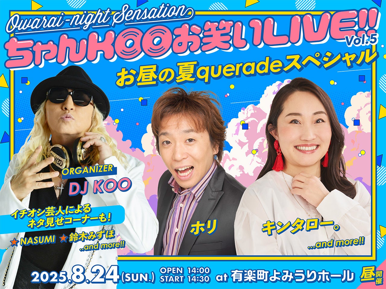 2025年8月24日(日)、DJ KOOのお笑いイベント「Owarai-night Sensation『DJ KOO presents ちゃんKOOお笑いLIVE!! vol.5』~お昼の夏queradeスペシャル~」「Owarai-night Sensation『DJ KOO presents ちゃんKOOお笑いLIVE!! vol.5』~夏い夜だから・・・超スペシャル~」を、東京・有楽町よみうりホールにて開催することが決定しました。