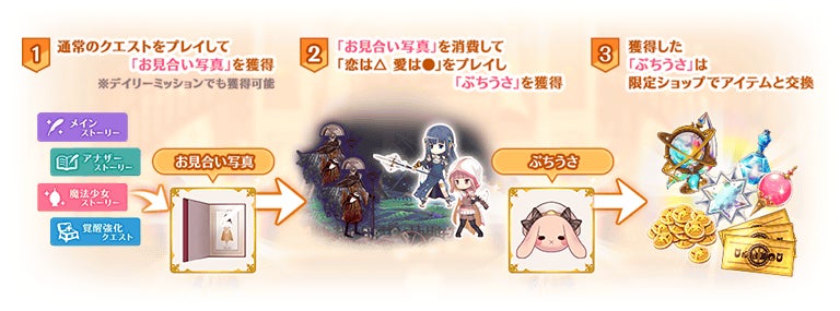 「お見合い写真」を消費すると本イベントのクエストをプレイでき、限定アイテムや覚醒素材と交換できる「ぷちうさ」を獲得できます。