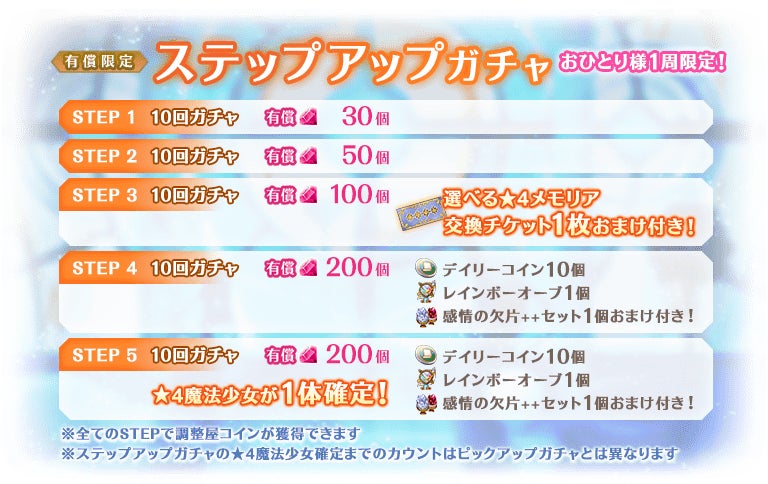 ※STEP5での★4魔法少女について、ピックアップ対象の魔法少女が確定するわけではございません。