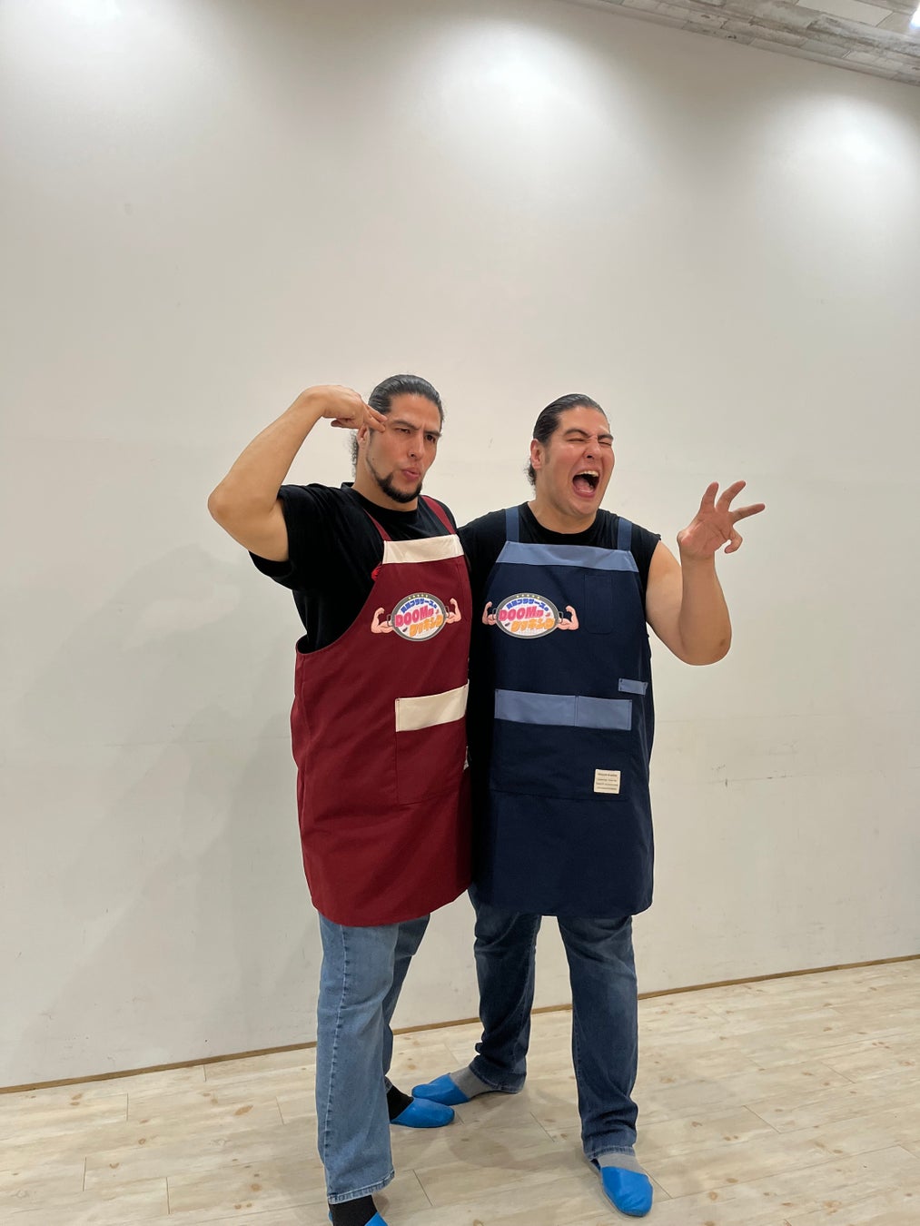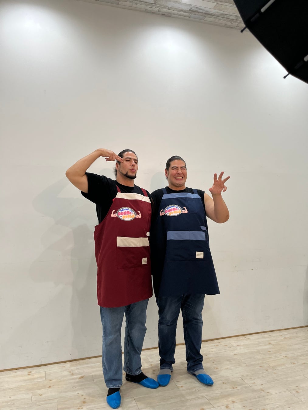 収録の始めに「エプロンにロゴが入ってる!」と喜んでいた二人は、番組特製エプロンを着用したまま写真撮影。疲れた顔も一切見せず、カメラを向けるとノリノリでポーズを決めてくれました。