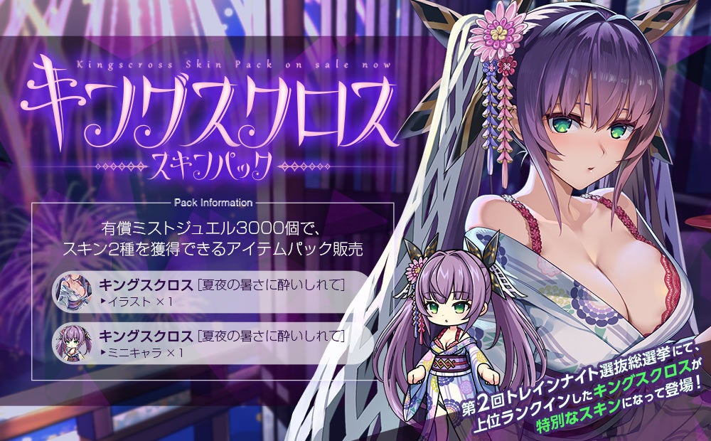 第二回トレインナイト選抜総選挙にて、上位ランクインした"キングスクロス"の立ち絵と、ミニキャラの衣装変更できる特別なスキンパックを販売いたします。