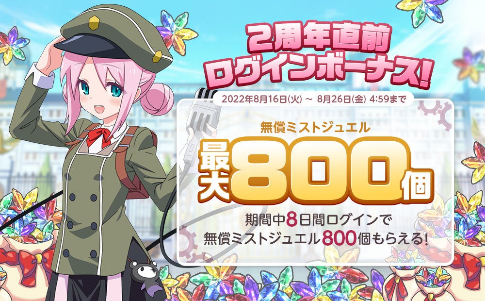 期間中8日間ログインで、無償ミストジュエル最大800個をプレゼントいたします。