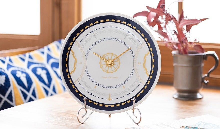 ルドガーが持っている懐中時計をイメージした陶磁器製のクロックです。 盤面の左右には、ゲーム内の選択肢画面をイメージしたプリントが。 文字盤の部分は、サスペンダーの装飾をメインに、6 時の部分に「クルスニクの槍」の装飾を配置いたしました。 秒針がないため、音を気にせずお使いいただけます。
