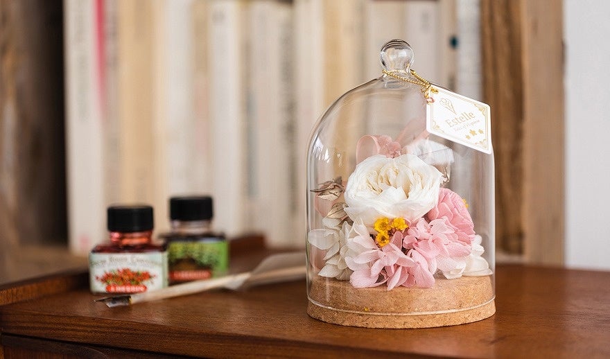 可憐でボリューム感のあるバラを配置し、 衣裳をイメージした優しい白と淡いピンクのカラーでまとめた、 エステルらしい品のあるインテリアフラワーです。 飾って楽しむのはもちろん、写真の撮影背景・小物としても。置く場所を選ばないサイズ感。