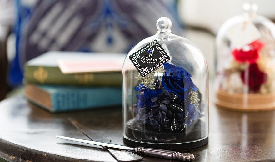 作中に登場するバラをイメージしたブルーローズをメイン。 正義感あふれるアルフェンらしい、スタイリッシュな雰囲気のアレンジメントです。 飾って楽しむのはもちろん、写真の撮影背景・小物としても。置く場所を選ばないサイズ感。