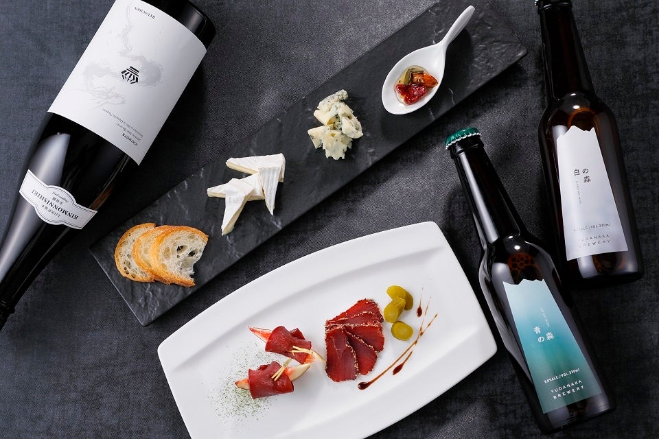 メインバー「フォンタナ・ディ・トレビ」では、長野県の北部に位置する野沢温泉蒸留所の4種のクラフトジン、「NOZAWA GIN」「CLASSIC DRY GIN」「IWAI GIN」「SHISO GIN」を使ったオリジナルカクテルや、湯田中温泉の旅館あぶらや燈千が運営するYUDANAKA BREWERYのクラフトビール「青の森」「白の森」、大町市の株式会社市野屋が醸造する日本酒「RYUSUISEN生酛Alc13上白沢伏流水仕込み金紋錦」などを販売します。東御市のアトリエ・ド・フロマージュが製造する「ブルーチーズ」や「カマンベールチーズ」に、長野市の更科養蜂苑の「はちみつこの実」をトッピングしたチーズの盛り合わせや、泰阜村(やすおかむら)産鹿肉の生ハムとパストラミの盛り合わせといった、お酒のお供にぴったりなフードアイテムと一緒にご堪能ください。