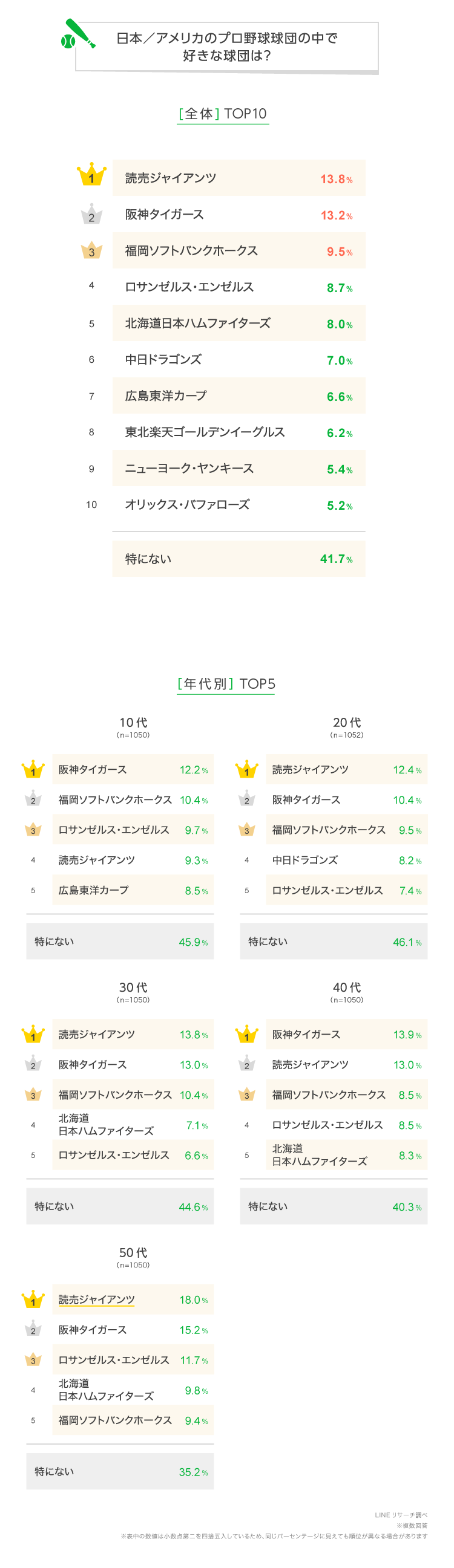 そして、好きな球団の全体TOP2は「読売ジャイアンツ」「阪神タイガース」で、僅差となりました。全体3位は「福岡ソフトバンクホークス」、4位は「ロサンゼルス・エンゼルス」、5位は「北海道日本ハムファイターズ」という結果となりました。