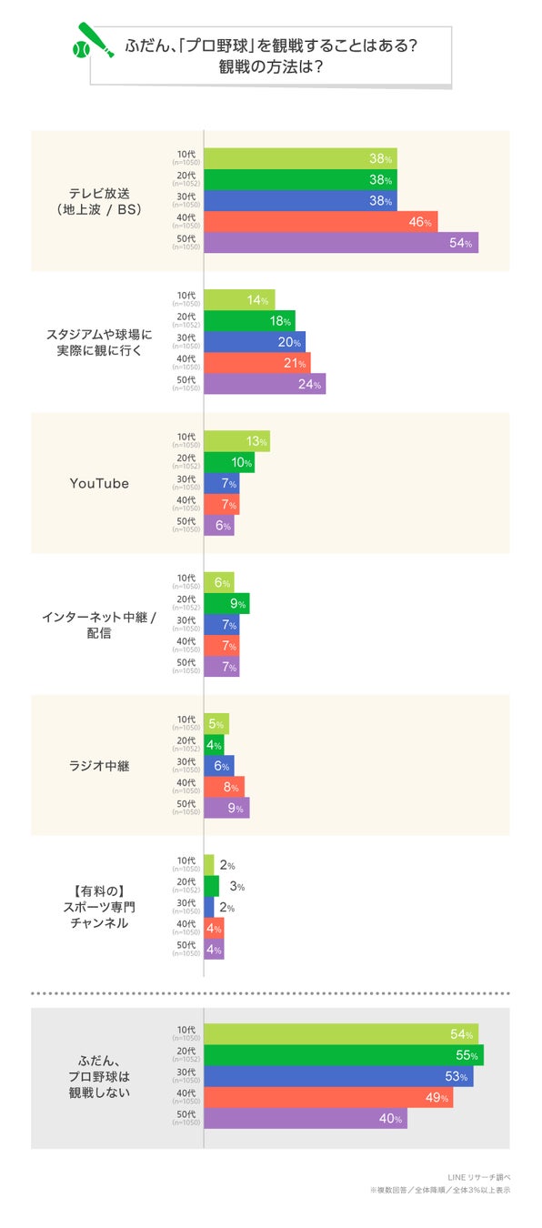 【LINEリサーチ】プロ野球を観戦する人は約半数で50代で最も高い結果に 観戦方法は「テレビ放送(地上波/BS)」が全体1位 好きな球団は「読売ジャイアンツ」「阪神タイガース」が上位にランクイン