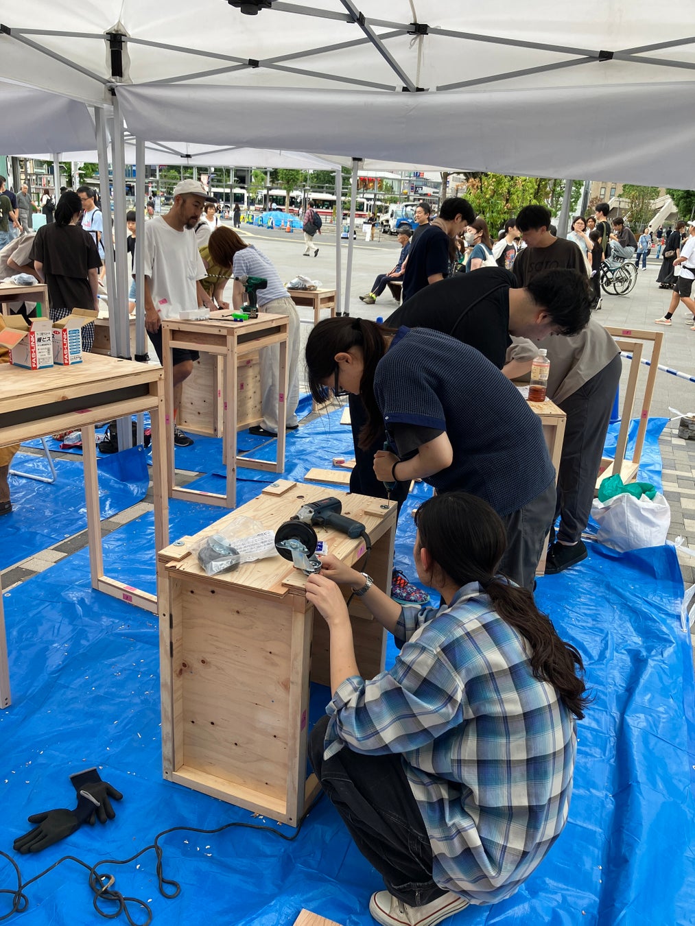 今村謙人さんを講師に迎え「屋台づくりワークショップ」を開催。出来上がった屋台を並べて本番の10月25日に向けてデモ販売も敢行。自分の特技や制作している作品などを商品として屋台の上に乗せ、街の人たちへ披露しました。