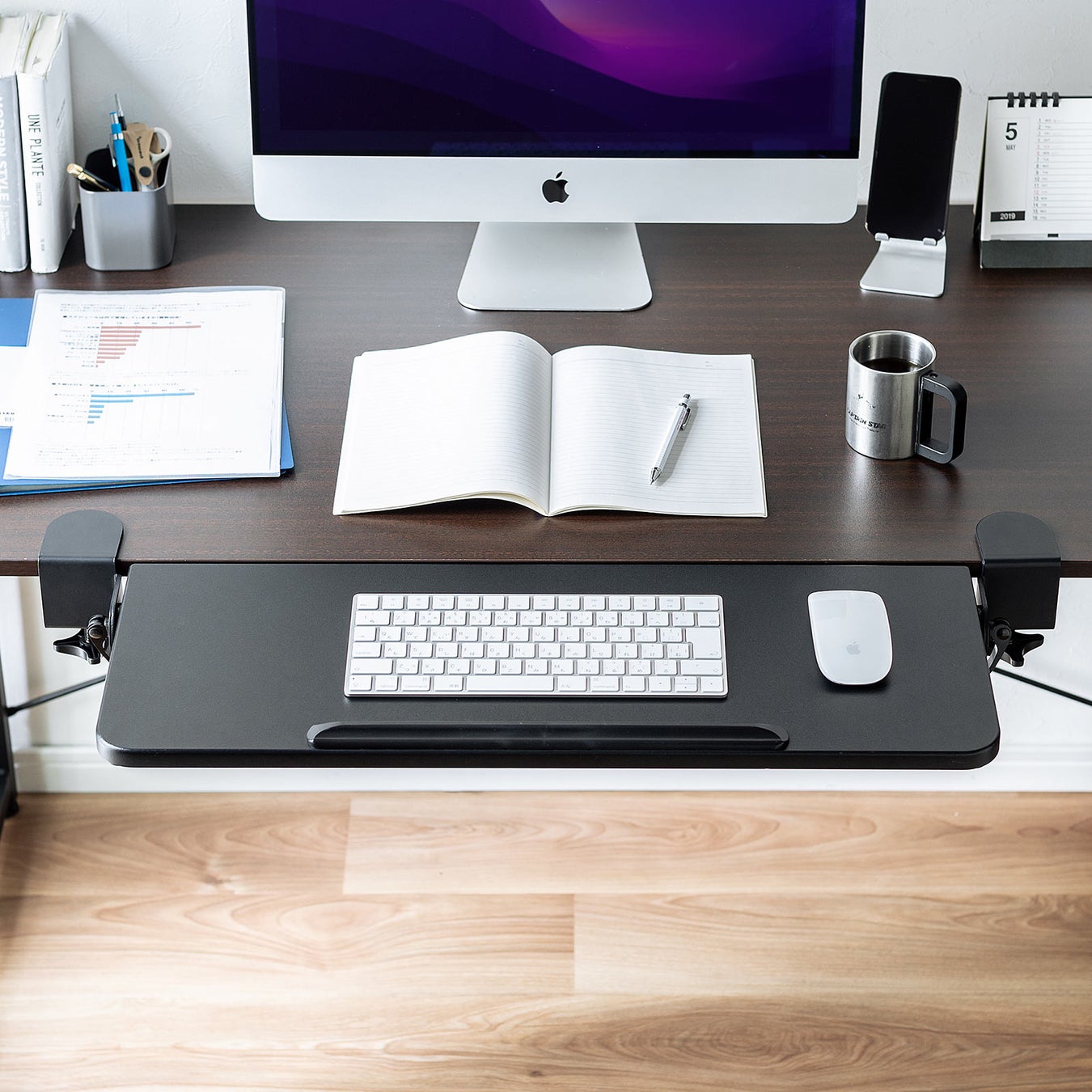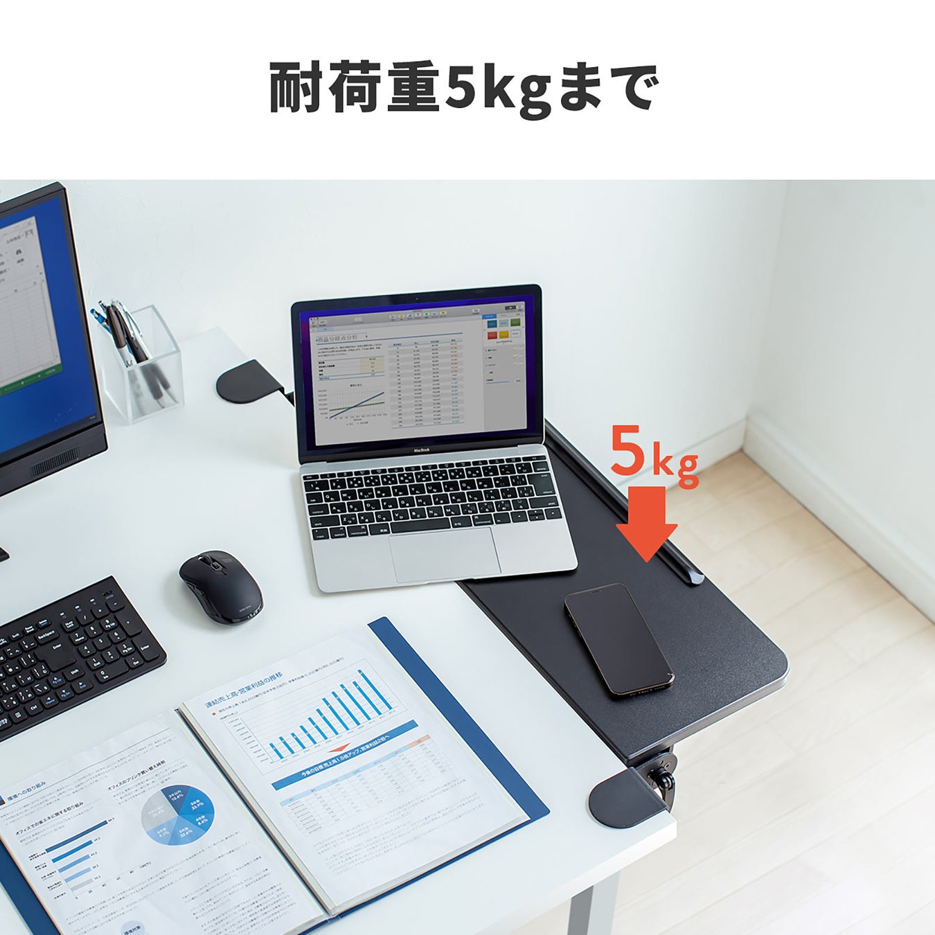本製品は、既存のデスクにクランプで簡単に取付ができる拡張テーブルです。テーブルサイズは約幅65×奥行23cmです。