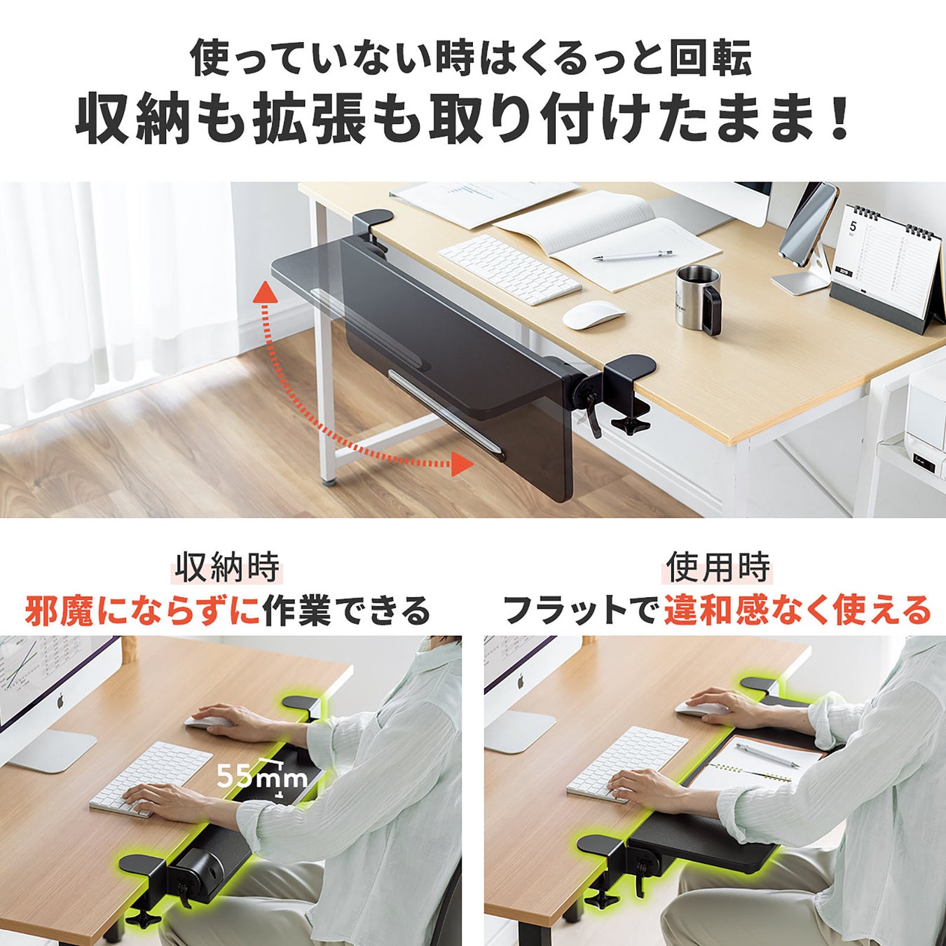 サンワサプライ株式会社(本社:岡山市北区田町1-10-1、 代表取締役社長 山田 和範)が運営している直販サイト『サンワダイレクト』では、クランプで簡単に後付でき、使用しないときは天板の裏に折り畳めるデスクエクステンダー「100-KB011BK」を発売しました。