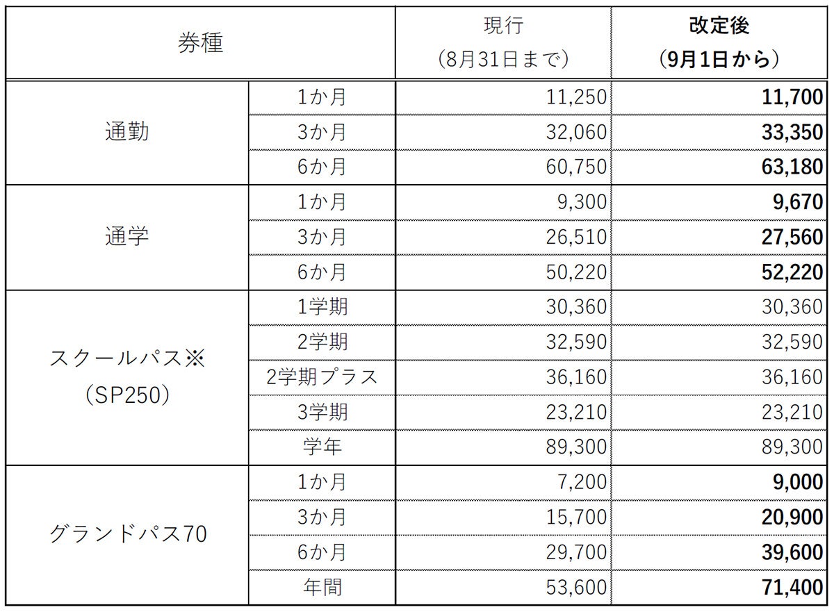 ※スクールパス(SP250)は、現行の価格で当社260円区間の乗車が可能です。