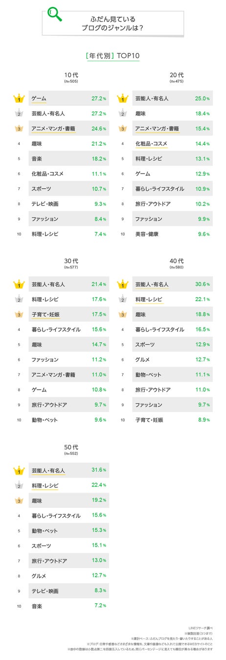 【LINEリサーチ】ブログを見たり書いたりする人は全体で5割強、特に30〜40代での割合が高めの傾向に 見ているジャンルは「芸能人・有名人」がどの年代でも高く、10代では「ゲーム」がTOPに
