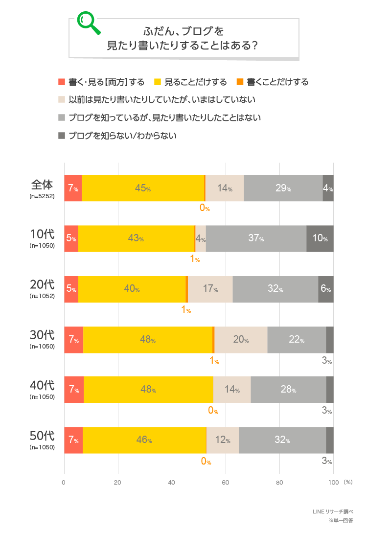 このたびLINEリサーチでは、日本全国の男女を対象に、2月6日のブログの日にちなんで、ブログを見たり書いたりする人の割合や、見ているブログのジャンルについて調査しましたので、その結果をお知らせいたします。