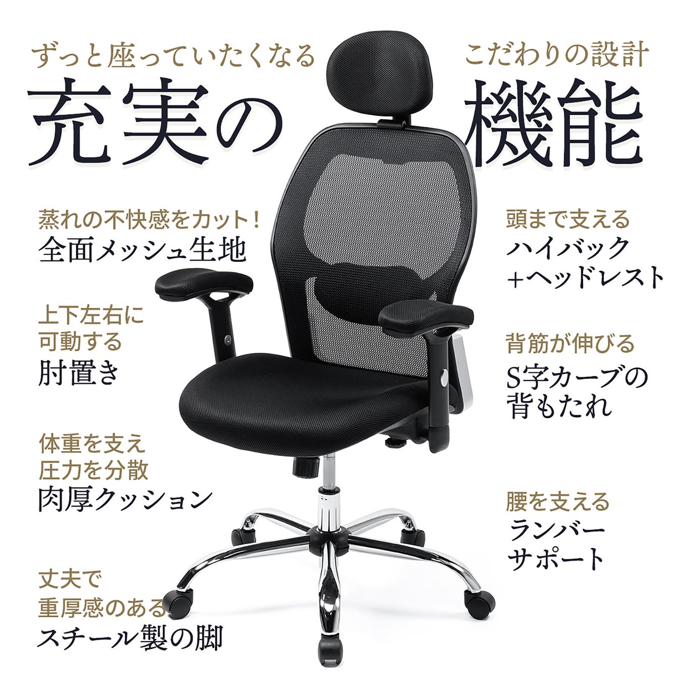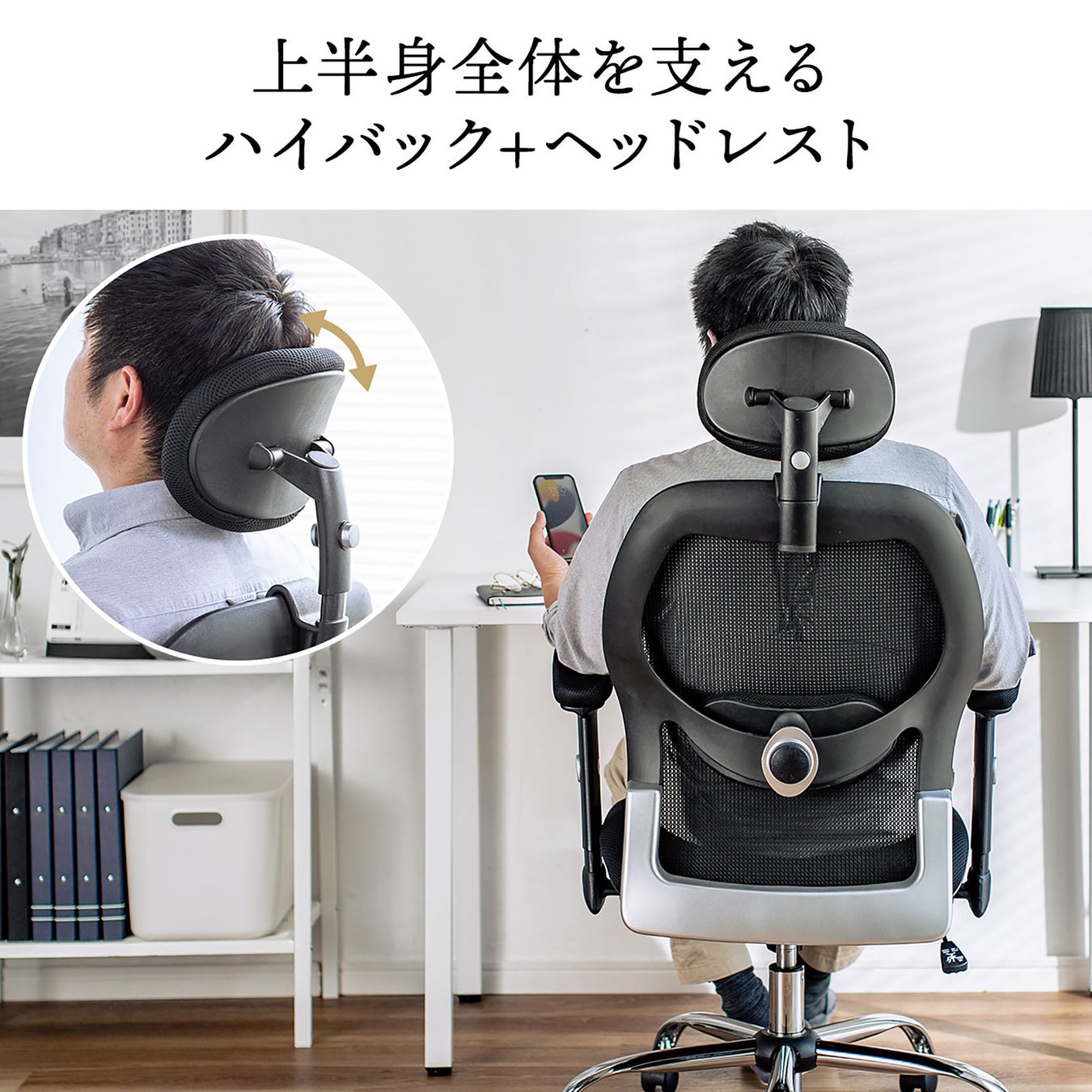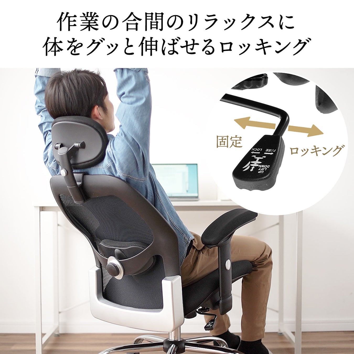 メッシュチェア オフィスチェア ハイバック 背座一体ロッキング 可動式アームレスト ヘッドレスト ランバーサポート 肉厚クッション