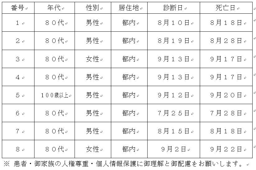 都内で新型コロナウイルスに感染した方が死亡されましたのでお知らせします。