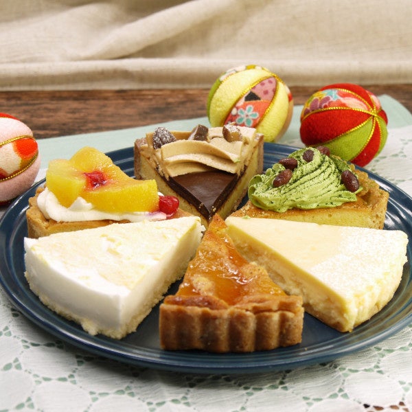 「クワトロレアチーズ」「黄桃のタルト」「生チョコモンブランタルト」「抹茶と小豆のタルト」「NYチーズケーキ」「りんごの紅茶タルト」の6種類のケーキを詰め合わせました。子どもから大人まで人気のフレーバーをお楽しみいただけます。