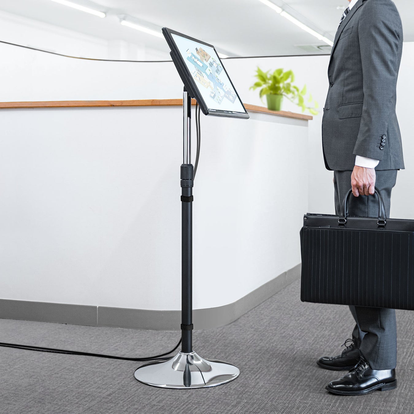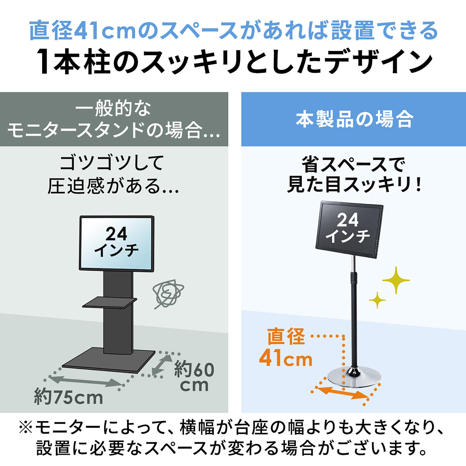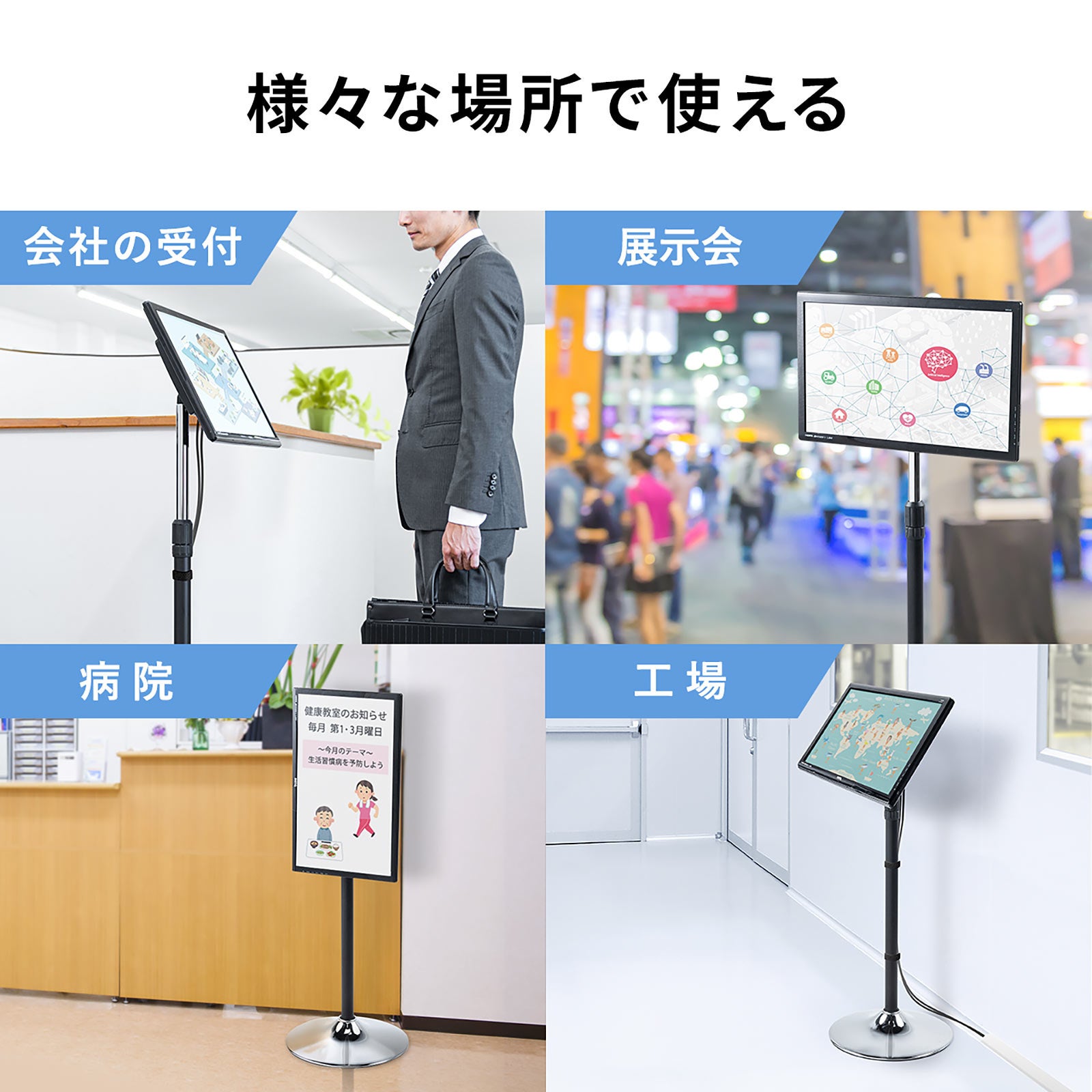 本製品は、モニターを設置できる、モニタースタンドです。すっきりとした一本支柱で、会社の案内板としてや展示会用、病院や工場などのディスプレイの用途して使用できます。