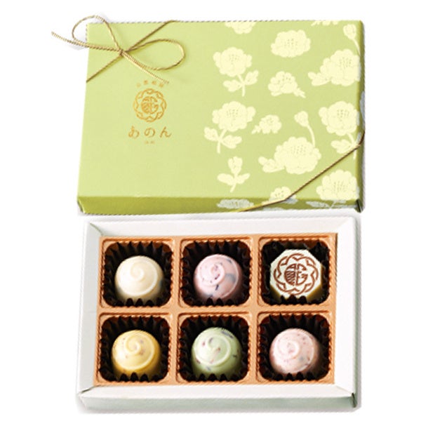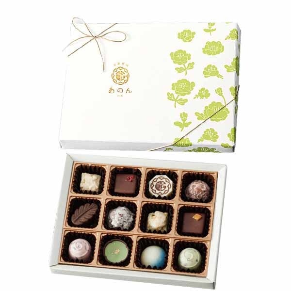 和菓子の枠にとらわれない自由な発想の和菓子を提案する、京都祇園の和菓子屋「あのん」のチョコレートです。フリーズドライした小豆とマスカルポーネやフルーツを使った商品や、抹茶やほうじ茶、日本酒など、和と洋がコラボレーションした味わいを楽しめます。