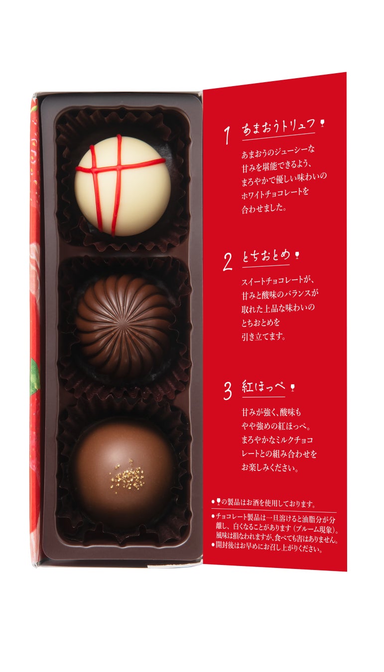 いちごやコーヒー、ナッツ、洋酒など、それぞれのテーマごとに3種類の素材を使用したチョコレートを手軽に、お手頃価格で味わうことができるチョコレートです。素材を前面に押し出した、温かみのある可愛らしいパッケージも特長です。