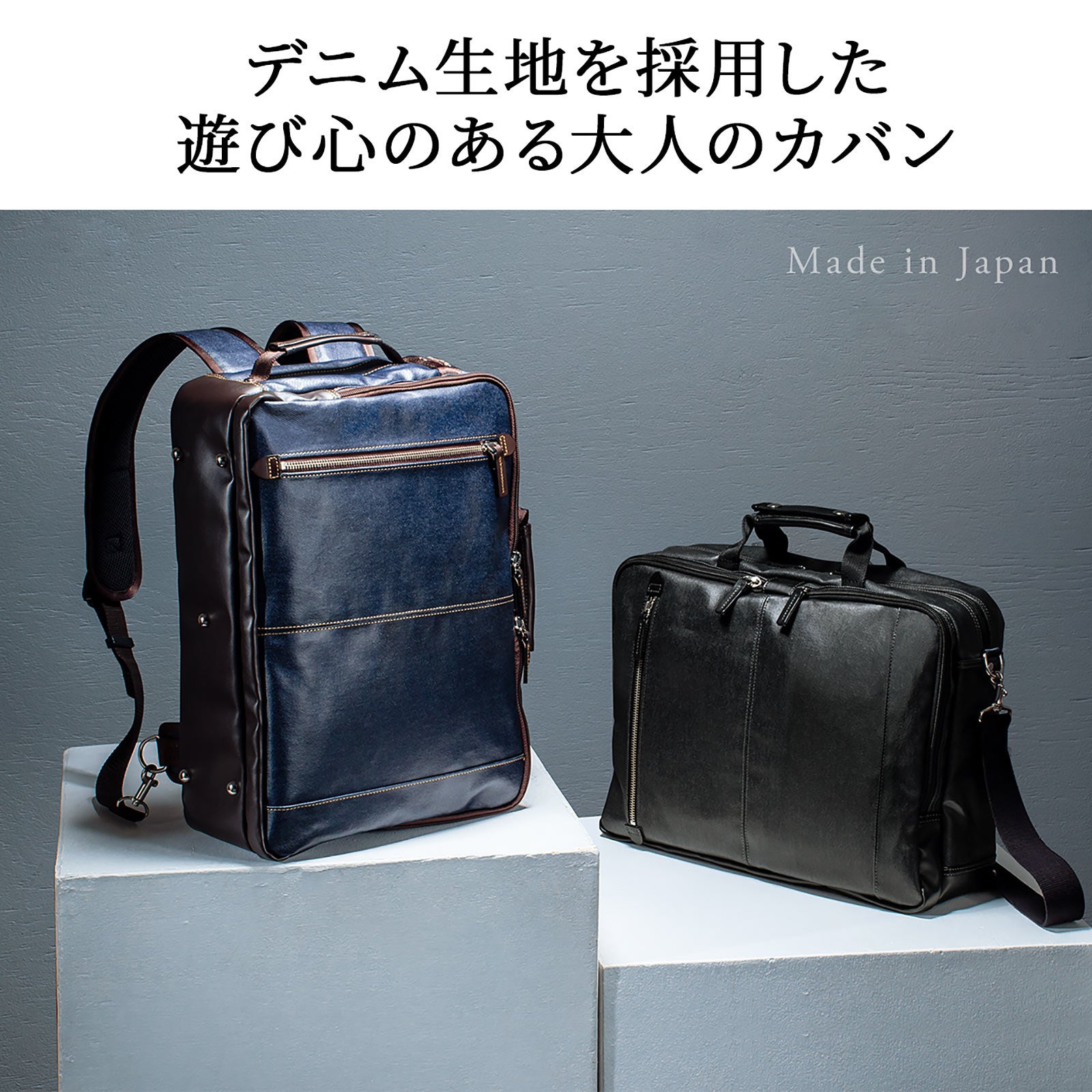 本製品は、岡山デニムを使用し豊岡で制作した日本製の3WAYビジネスバッグです。リュック、ショルダー、手提げの3通りの使い方ができます。素材は、パワフルな使用にも耐えるデニム生地を採用し撥水コーティングでサラッとした手触りで雨や汚れ、色落ちなども防ぎます。国産ジーンズの発祥地とされる、岡山産の児島デニムを使用しており、鞄制作の一大産地となる兵庫県豊岡で縫製をしています。