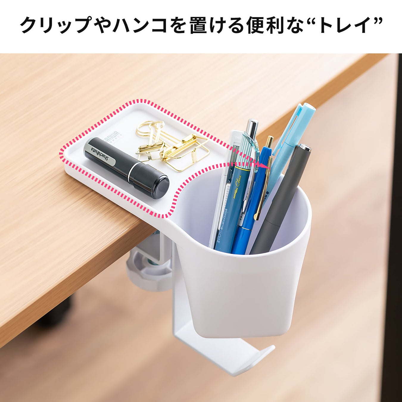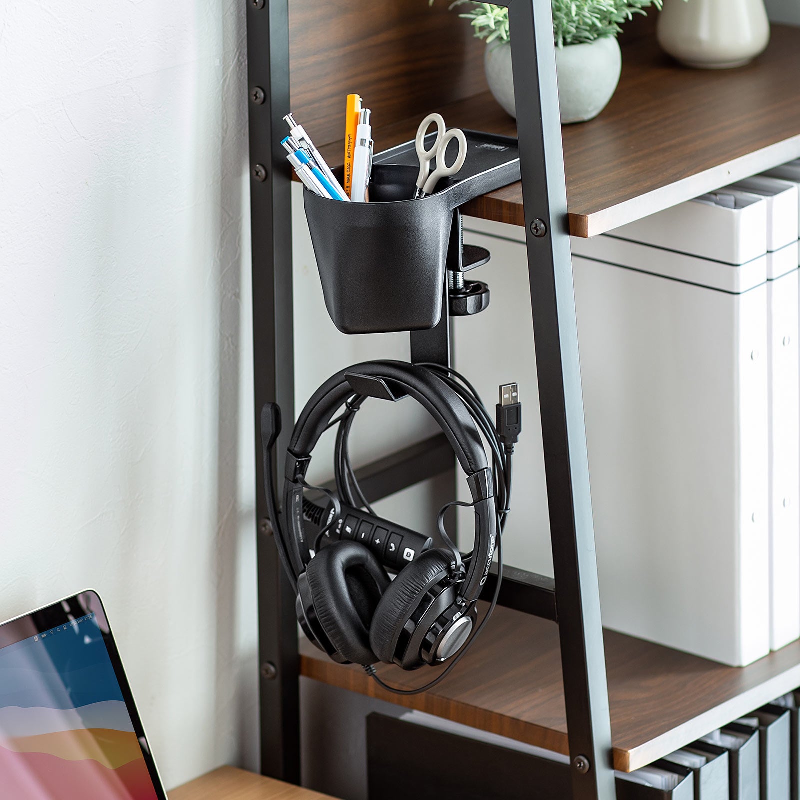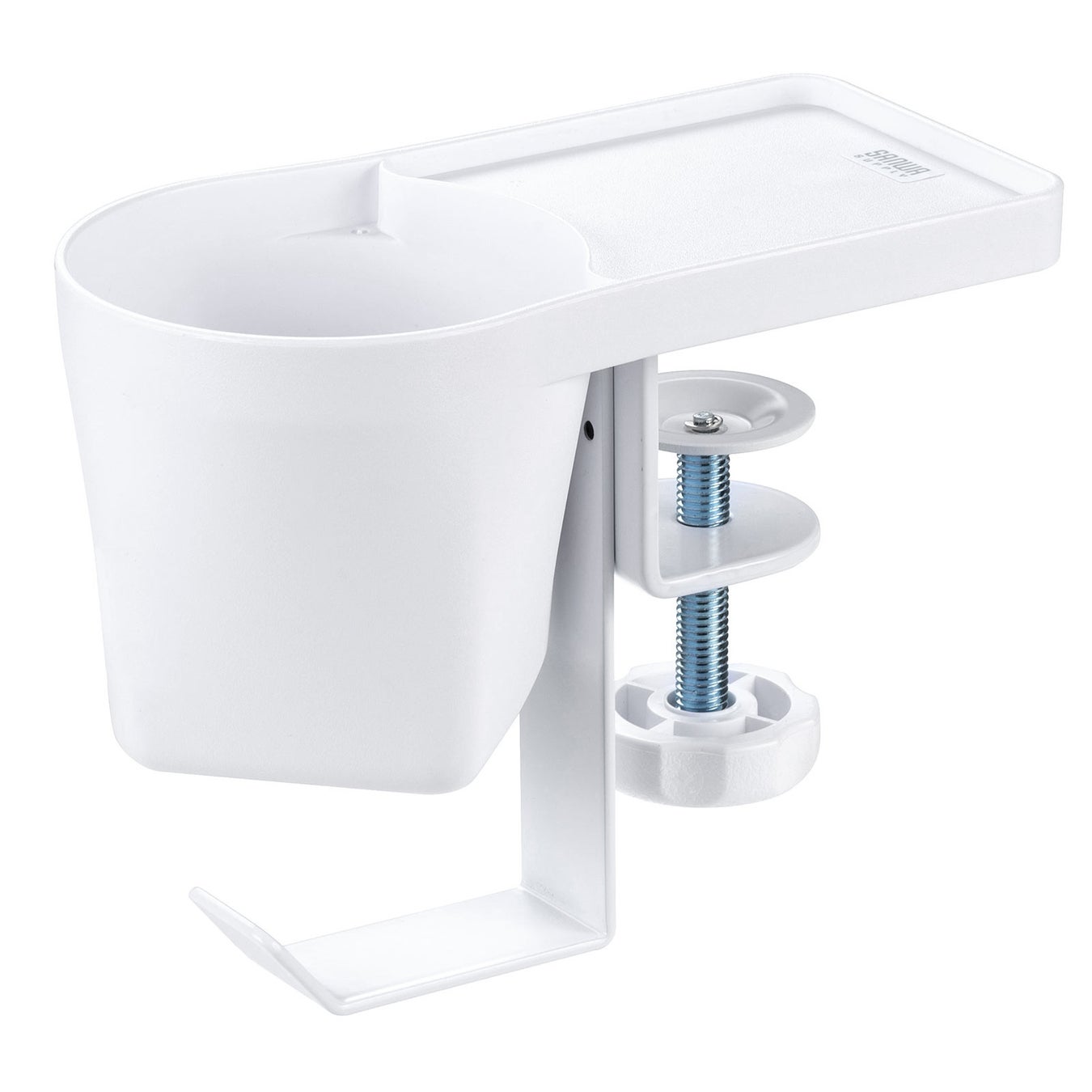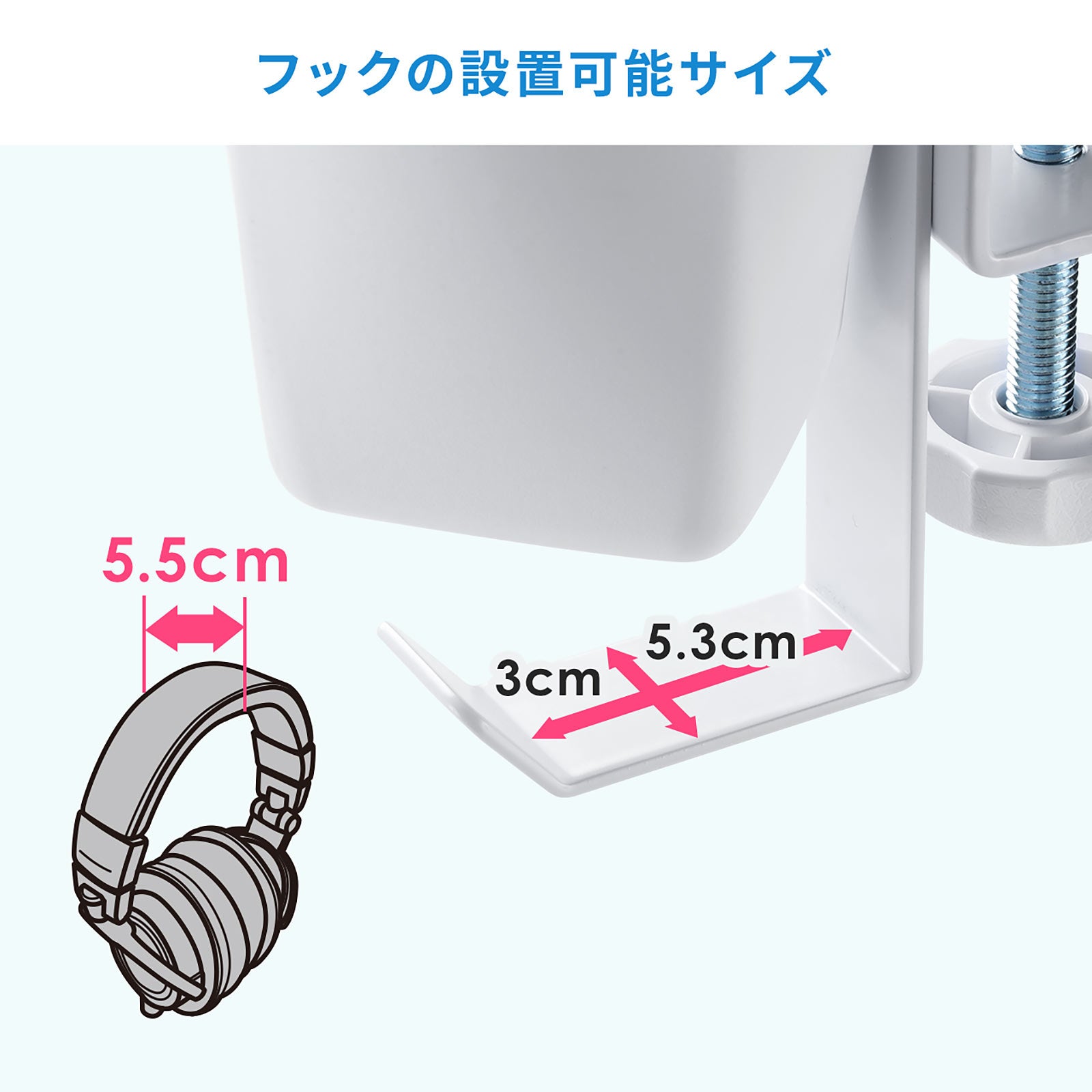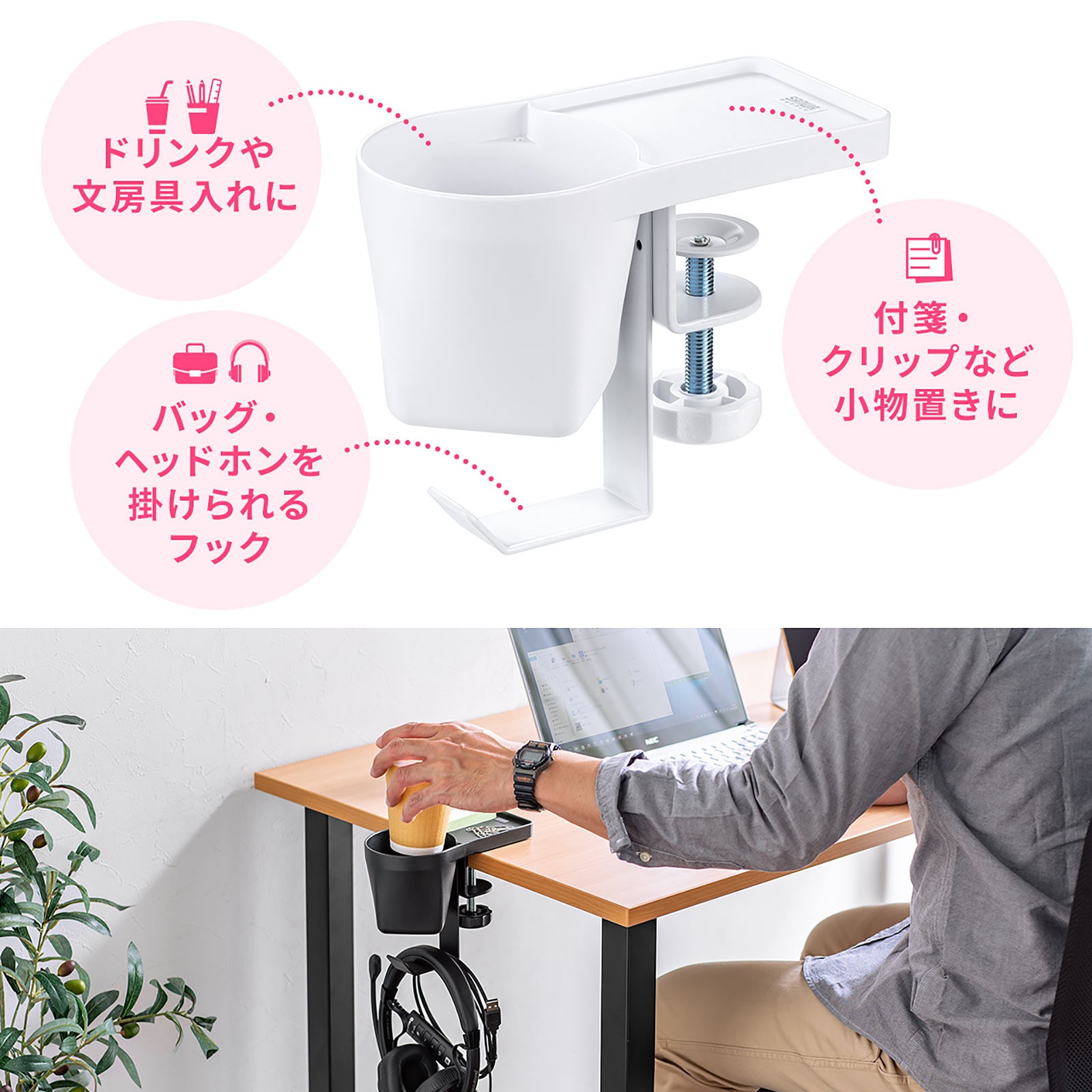 クランプ式ヘッドホンホルダー バッグハンガー ドリンクホルダー カップホルダー 収納ポケット 机 PCデスク 棚 金属製 リモートワーク ホワイト