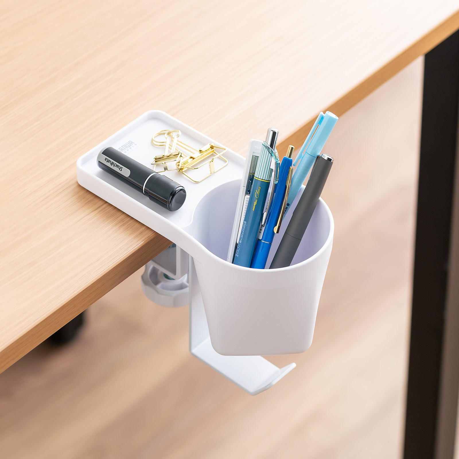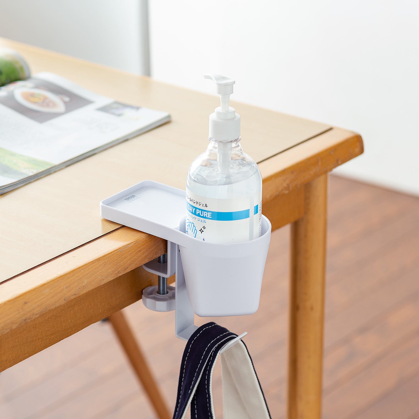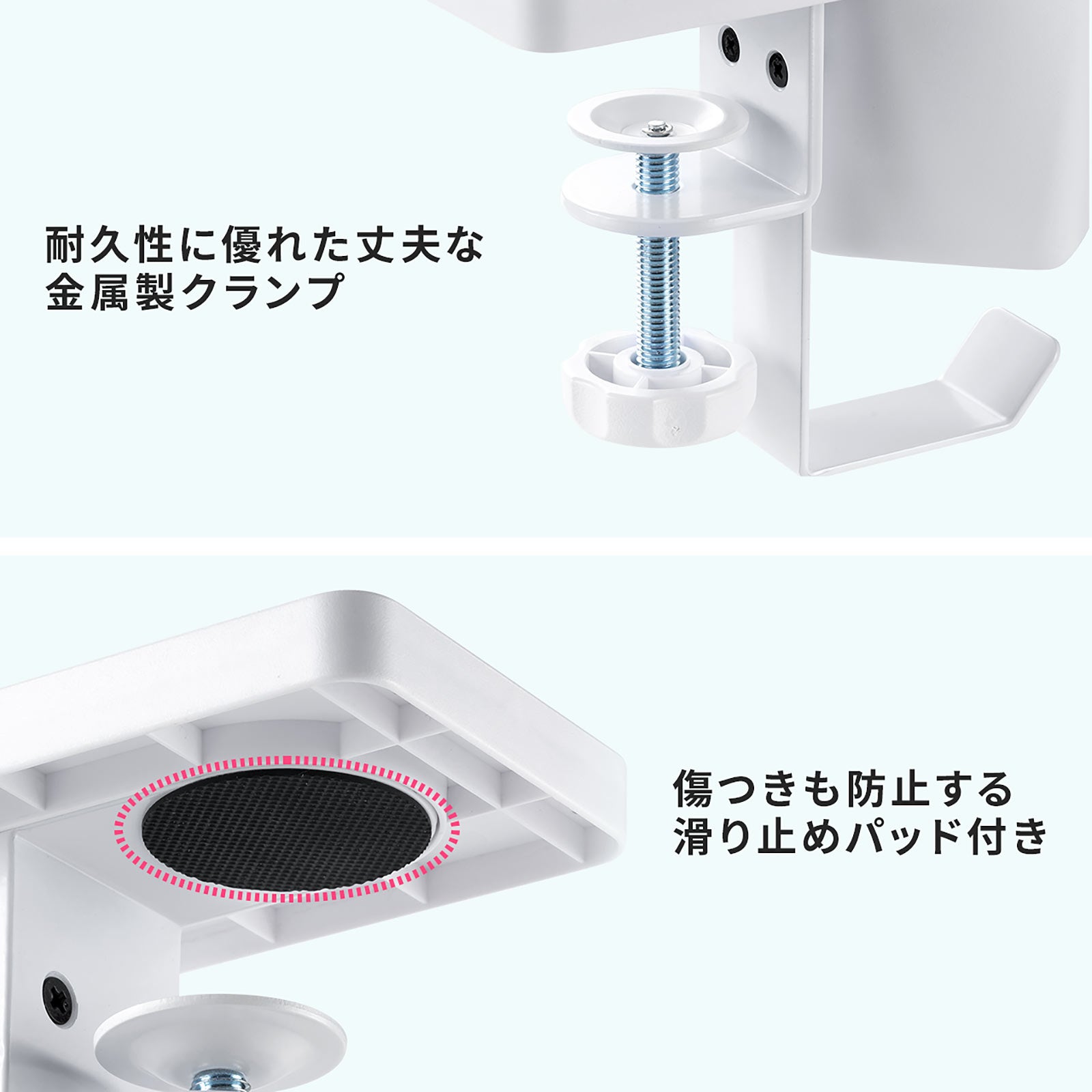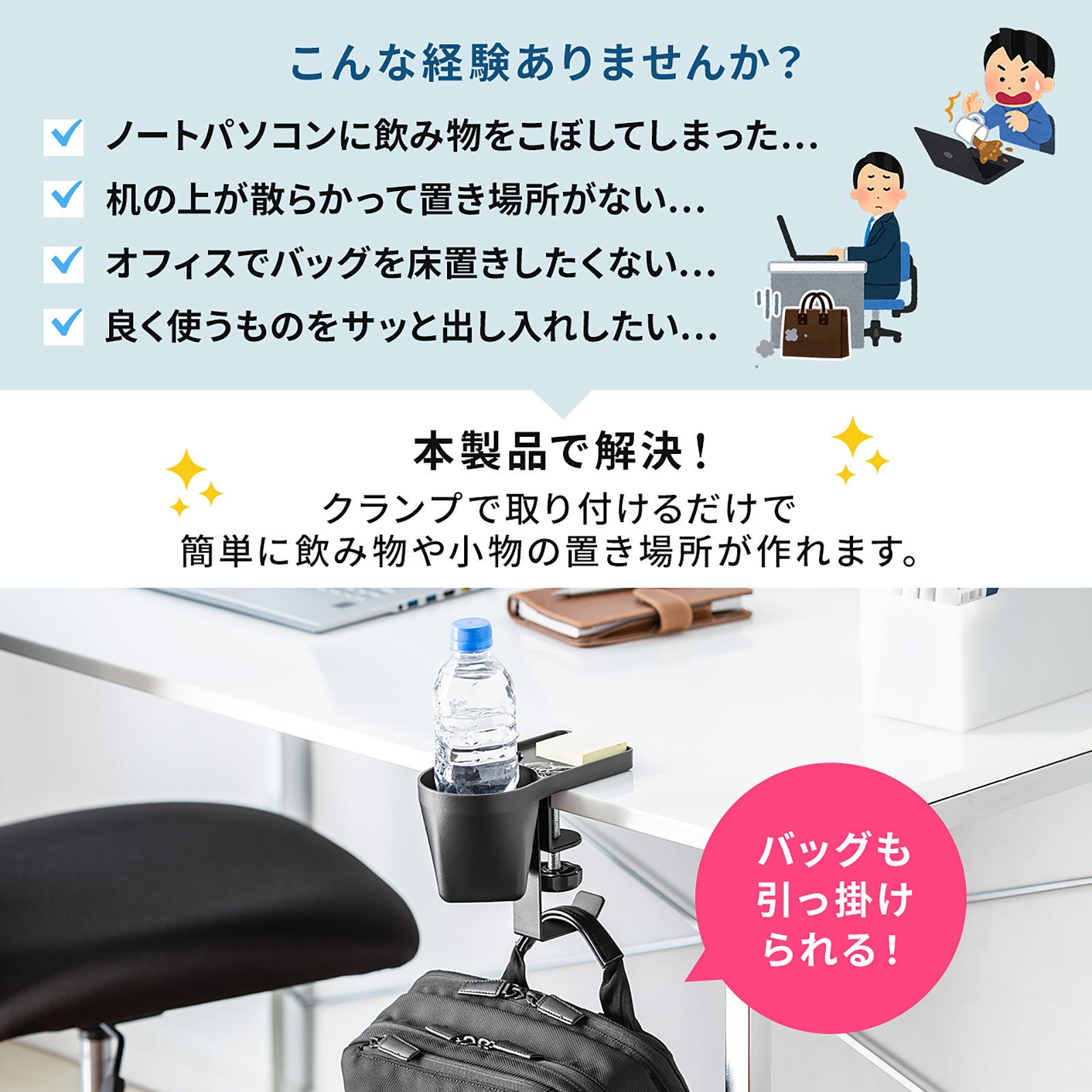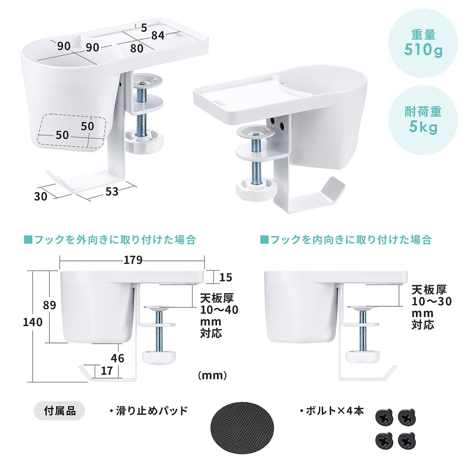 クランプ式ヘッドホンホルダー バッグハンガー ドリンクホルダー カップホルダー 収納ポケット 机 PCデスク 棚 金属製 リモートワーク ホワイト
