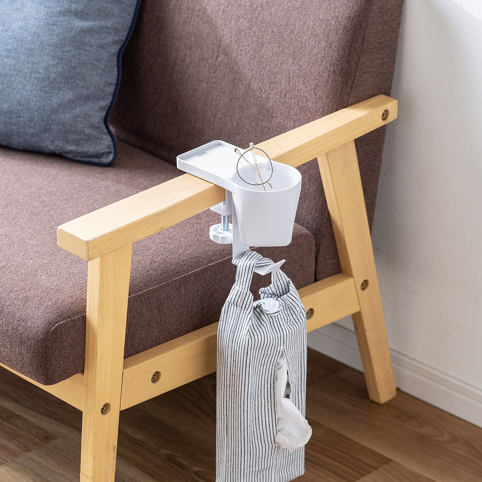 本製品は、デスクや棚、ソファーのアームレスト、ベッドサイドテーブルなど、クランプ固定でしっかり設置できるヘッドホンホルダーです。