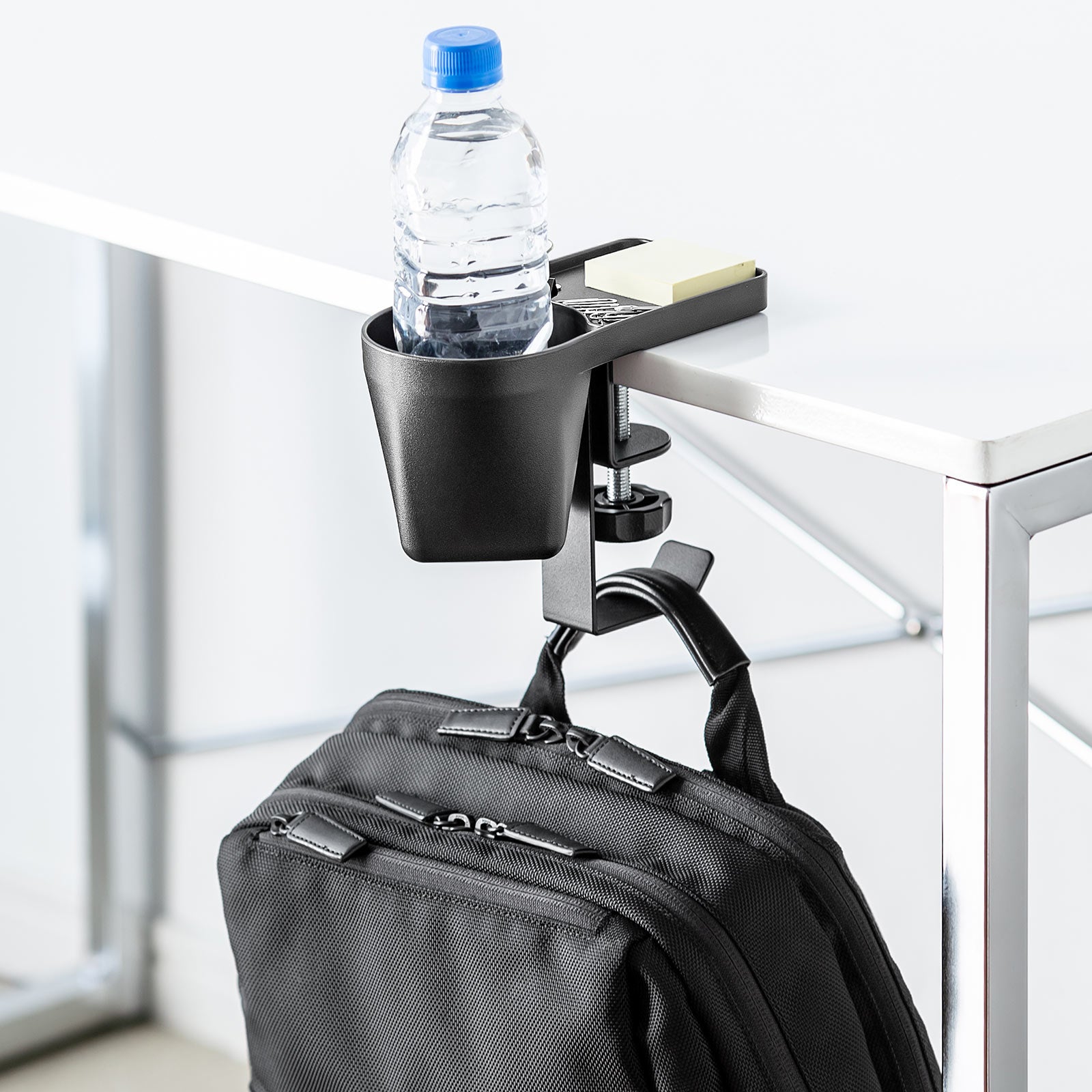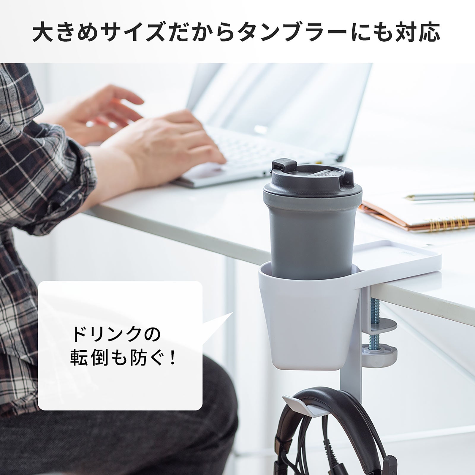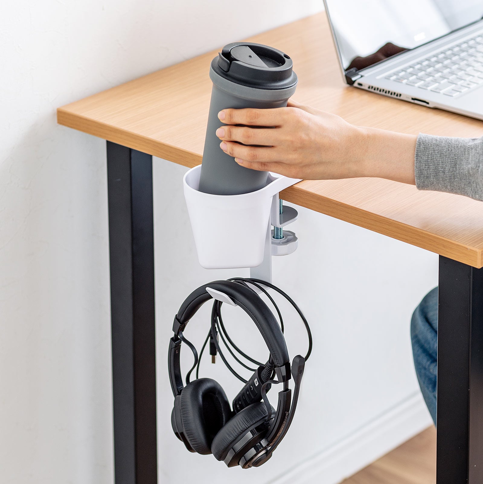クランプで机に後付けできるドリンクホルダー付きヘッドホンハンガーを6月15日発売