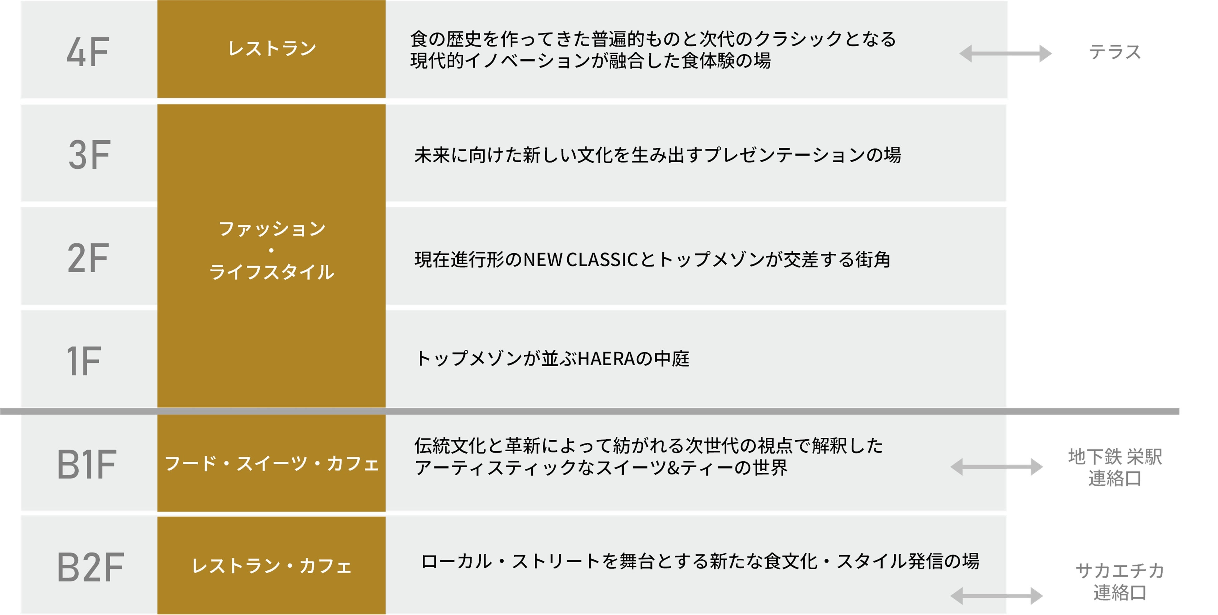 「ザ・ランドマーク名古屋栄」の地下2階~地上4階にてオープンするHAERAは、久屋大通、広小路通、錦通、大津通の4つの大通りに囲まれ、地上の歩行者の回遊性ならびに地下ネットワークの向上に貢献します。B1Fは地下鉄栄駅の改札口に、B2Fは商業地下街に直結しています。徒歩、自動車、電車、バス全ての交通手段による全天候型のシームレスなアクセス動線を実現します。