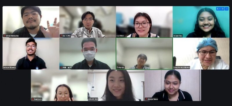 初開催となった「GMN1」には、大学間協定校であるシスター・ニヴェディータ大学の修士課程学生3人、本学の日本人学生(学部生、大学院生)2人、留学生(大学院生)3人、教職員3人、さらにペルーからの有識者1人が参加し、本学大学院医歯薬学総合研究科初の完全オンラインプログラム(※)として国際色豊かに開催しました。