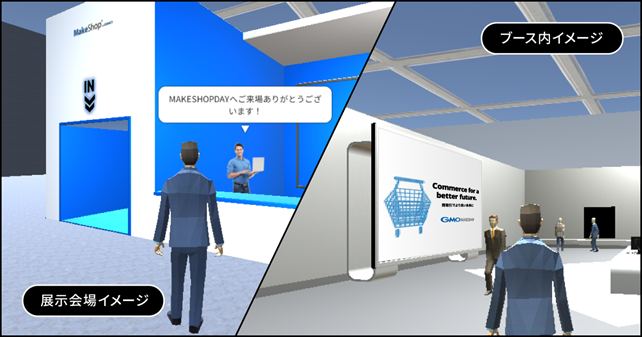 さらにオンラインでは、メタバース空間を利用したバーチャル展示会を同時開催し、バーチャルセミナー会場でセミナーの映像を生配信するとともに、バーチャル展示ブースを設けGMOメイクショップのサービスに関する資料の展示や、チャットやボイスチャットによる個別相談も実施いたします。