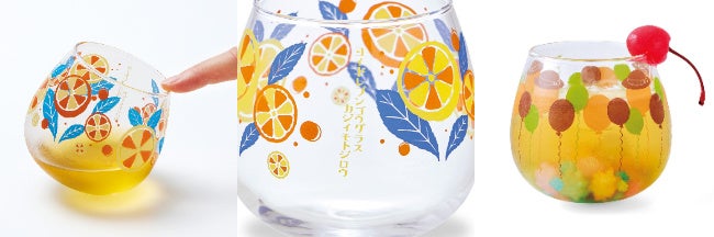 ゆらゆら揺れる、底が丸いグラスです。図柄の中にカタカナで作品と作家名も描かれています。作品をイメージしたカクテルなどを作って楽しむのもおすすめです。