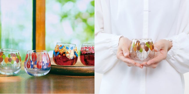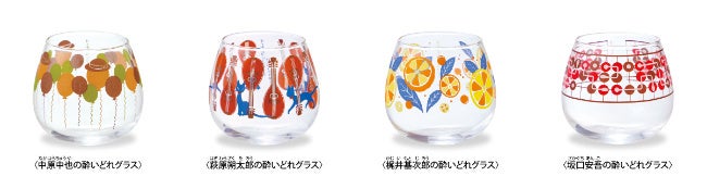 デザインは、昭和に活躍した作家や作品にまつわるモチーフをレトロな図柄に仕上げた4種類。作家が愛用した帽子と、著作『春日狂想』に登場するゴム風船がモチーフの〈中原中也の酔いどれグラス〉、作家が愛したマンドリンと著作『青猫』に登場する青い猫がモチーフの〈萩原朔太郎の酔いどれグラス〉、作家が愛したお茶の茶葉と著作『檸檬』に登場する檸檬がモチーフの〈梶井基次郎の酔いどれグラス〉、作家がたしなんだ囲碁と著作『夜長姫と耳男』に登場する蛇がモチーフの〈坂口安吾の酔いどれグラス〉です。