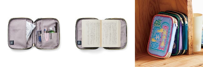全体が開くので中に入れたものをらくに取り出せます。文庫本をセットすればブックカバーとしても活躍します。読書中は内ポケットに栞をしまえます。本棚にそのまま立てて置いても◎。