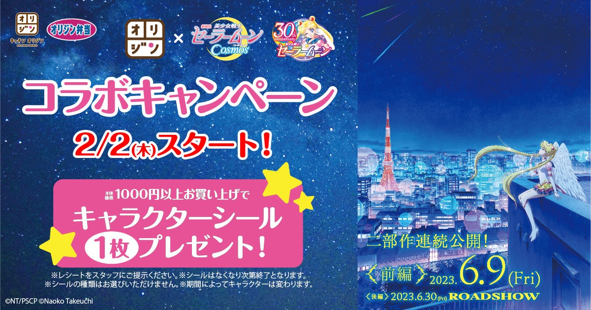 弁当・惣菜専門店「キッチンオリジン」「オリジン弁当」を展開しているイオングループのオリジン東秀株式会社(本社:東京都調布市/代表:沢村 弘也)は、前編6月9日(金)公開、後編6月30日(金)公開の劇場版「美少女戦士セーラームーンCosmos」とコラボキャンペーンを開催し、2月2日(木)10時より、本体価格1,000円以上お買い上げのお客さまにオリジナルキャラクターシールを1枚プレゼントいたします。