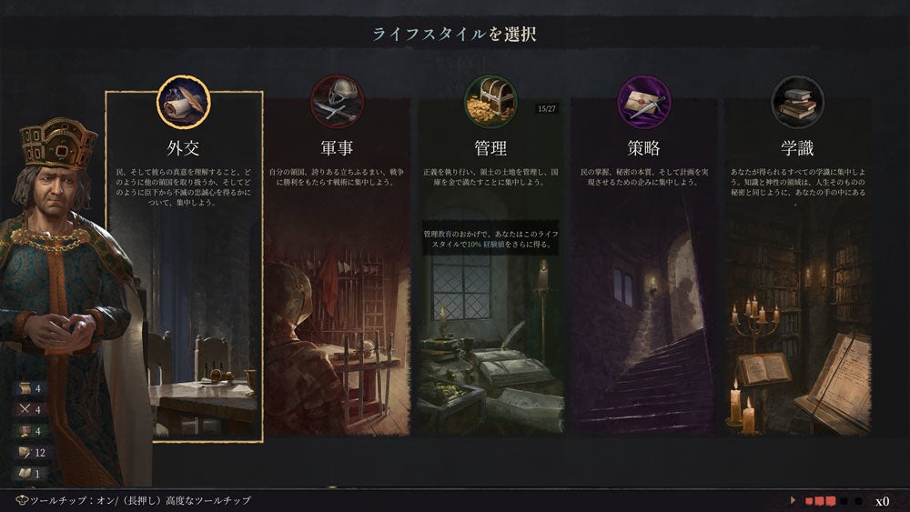 『クルセイダーキングスⅢ』は、キャラクターの性格に反した行動をすることでストレスが溜まり、一定値を超えると病気等の悪影響を受けてしまう「ストレスシステム」や、外交・軍事・管理・策略・学識という5つの項目と、それぞれに用意された3つのスキルツリーを強化することで幅広い育成ができる「ライフスタイル」といった新機能などが収録されています。