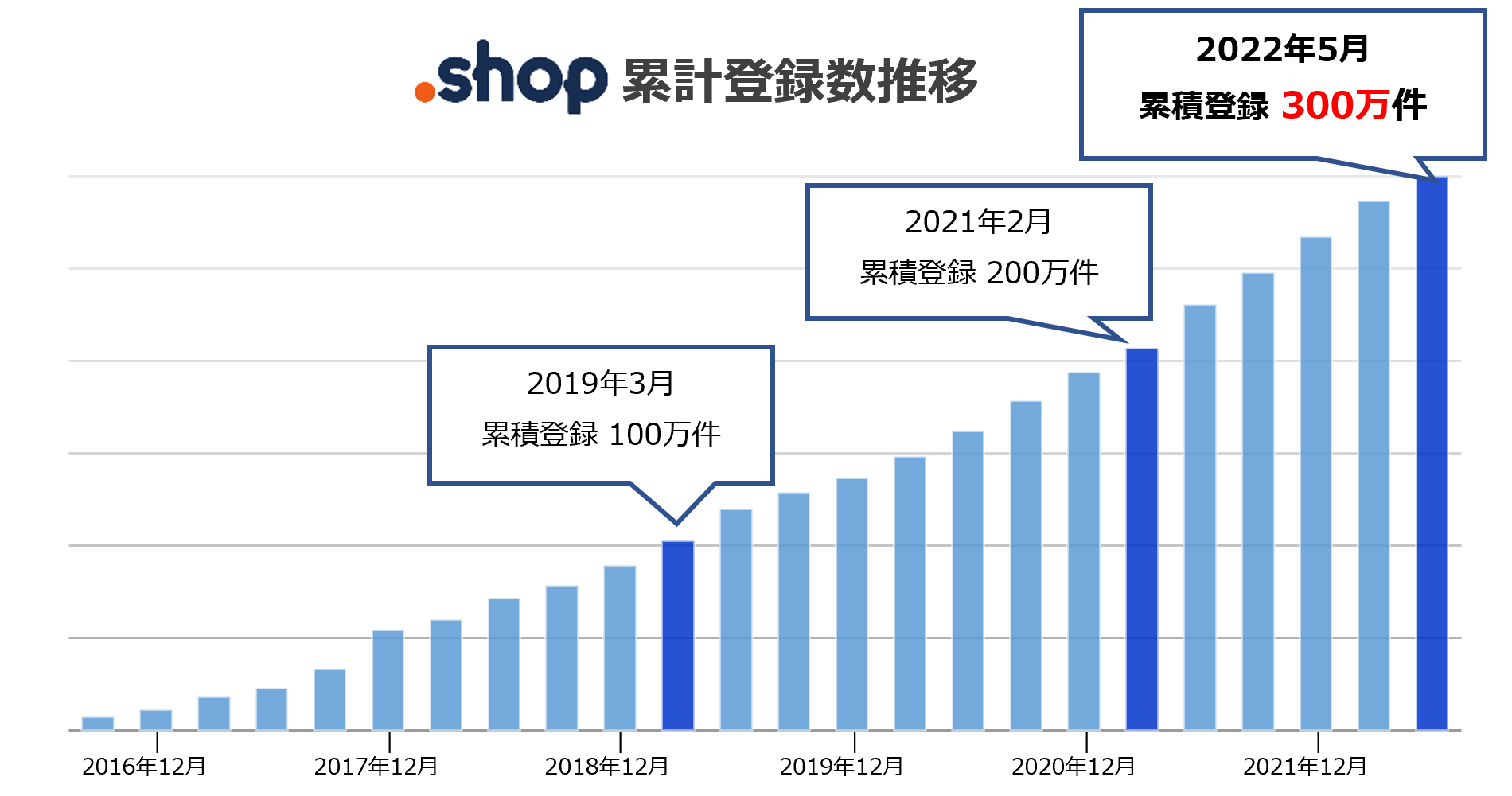 GMOインターネットグループでレジストリ事業を展開するGMOドメインレジストリ株式会社(以下、GMOドメインレジストリ)は、本日2022年5月27日(金)をもって、お店のためのドメイン「.shop」の累計登録数が300万件を突破しましたので、お知らせいたします。