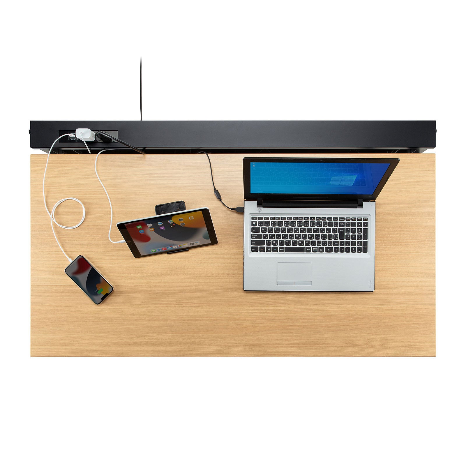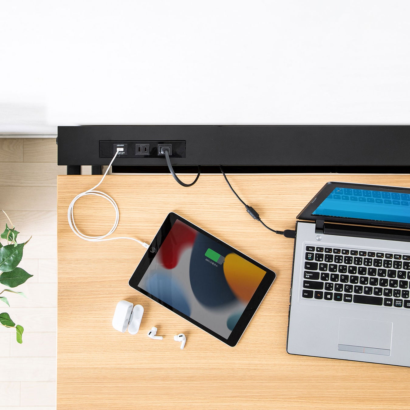ケーブルカバーに埋込コンセント(AC2個口、USB Aを1ポート)が備え付けてあり、電源が必要な機器をデスクから取ることができます。バックパネルにはケーブル類をまとめて収納しておけるケーブルトレーを2個標準装備しています。幅500mmと大きめな造りなので、タップなどを設置してケーブルをスッキリさせることができます。
