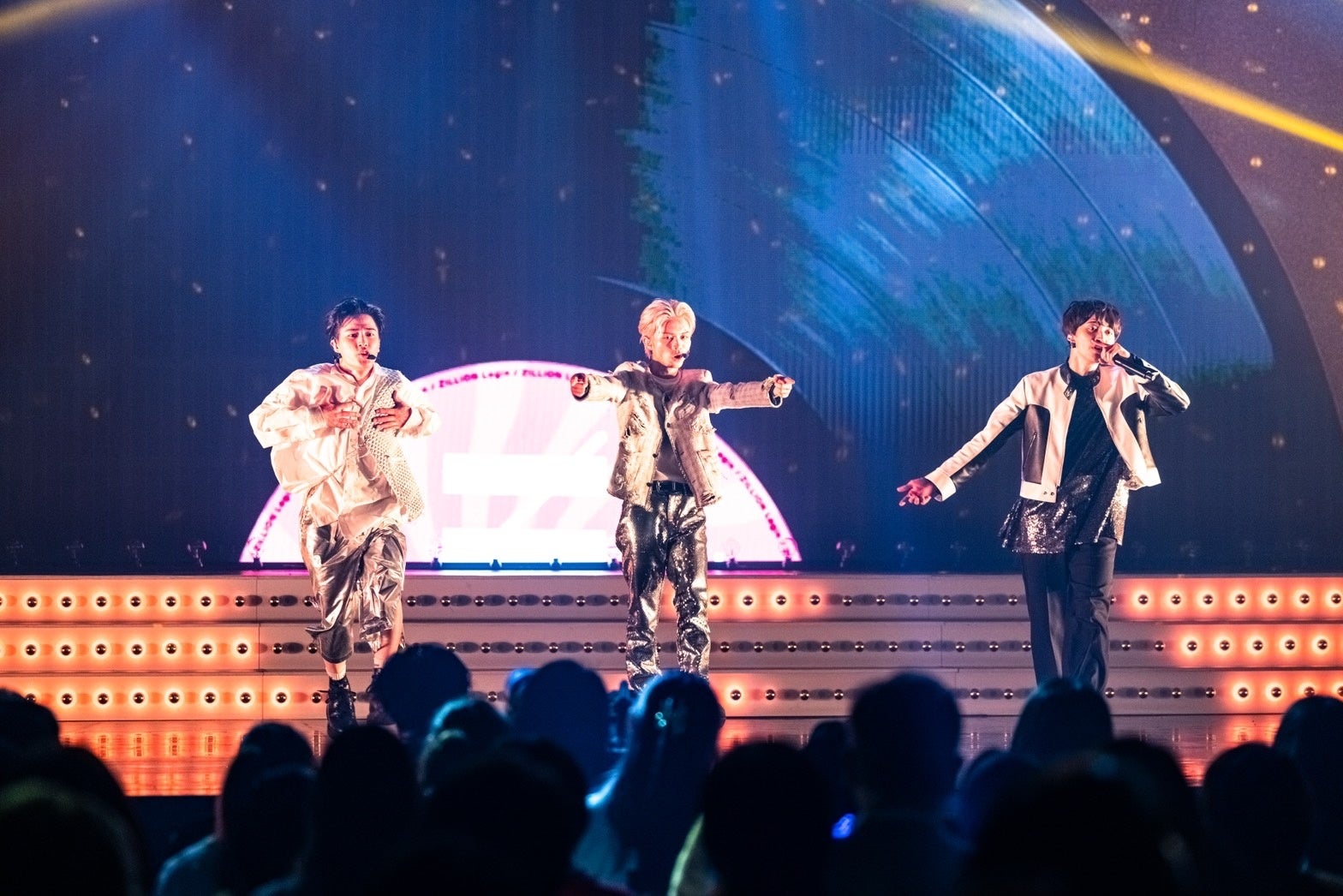 開演時間になると、ステージ全面を覆う紗幕にデジタルタイマーが映し出され、60秒のカウントダウンを始めるとともに場内がゆっくりと暗くなっていき、高揚感あふれるブレイクビーツに乗せて、メンバーが車や自転車でライブ会場に集合する映像からスタートした。続いて、サーチライトが交錯する中で紗幕が落ち、グループ名を模した電飾看板とともに横一列になったメンバーがステージに登場。モータウンサウンドをモチーフにしたレトロなソウルポップ「STEP」で派手に華やかにショウの幕を開けた。笑顔やグッドポーズのフリが印象的なオープニングナンバーでフロアをポジティヴなムードで満すと、Z世代らしくSNSがもたらすジレンマをユニークにコミカルに表現したナンバーを連発。速いパッセージの歌謡ソウル「やめとこっか」ではスマホの画面をスワイプすし、エイティーズのフレーバーを加味したオントレンドなシンセポップ「NO盛れ NO LIFE」ではクラップを誘発し、1曲の中で8人編成から5人編成となるフォーメーションも展開。アウトロでのメンバー一人一人によるあいさつを経て、ケイジのビートボックスをフィーチャー。フリースタイルで繰り出される低音の効いたビートボックスをバックに、カシンとワタルがジャンルの異なるダンスをソロで踊り、男性メンバー3人によるオリジナルの90’S R&Bナンバー「Login」ではオーディエンスの心と体をメロウに揺らし、グループの多面性をアピールして観客を盛り上げた。