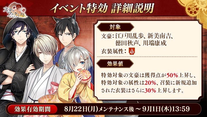 期間中「江戸川乱歩」「新美南吉」「徳田秋声」「川端康成」の衣装を編成して潜書すると、得点の獲得数がそれぞれ50%上昇します。また、「火」属性の衣装を編成して潜書すると、得点の獲得数がそれぞれ20%上昇します。